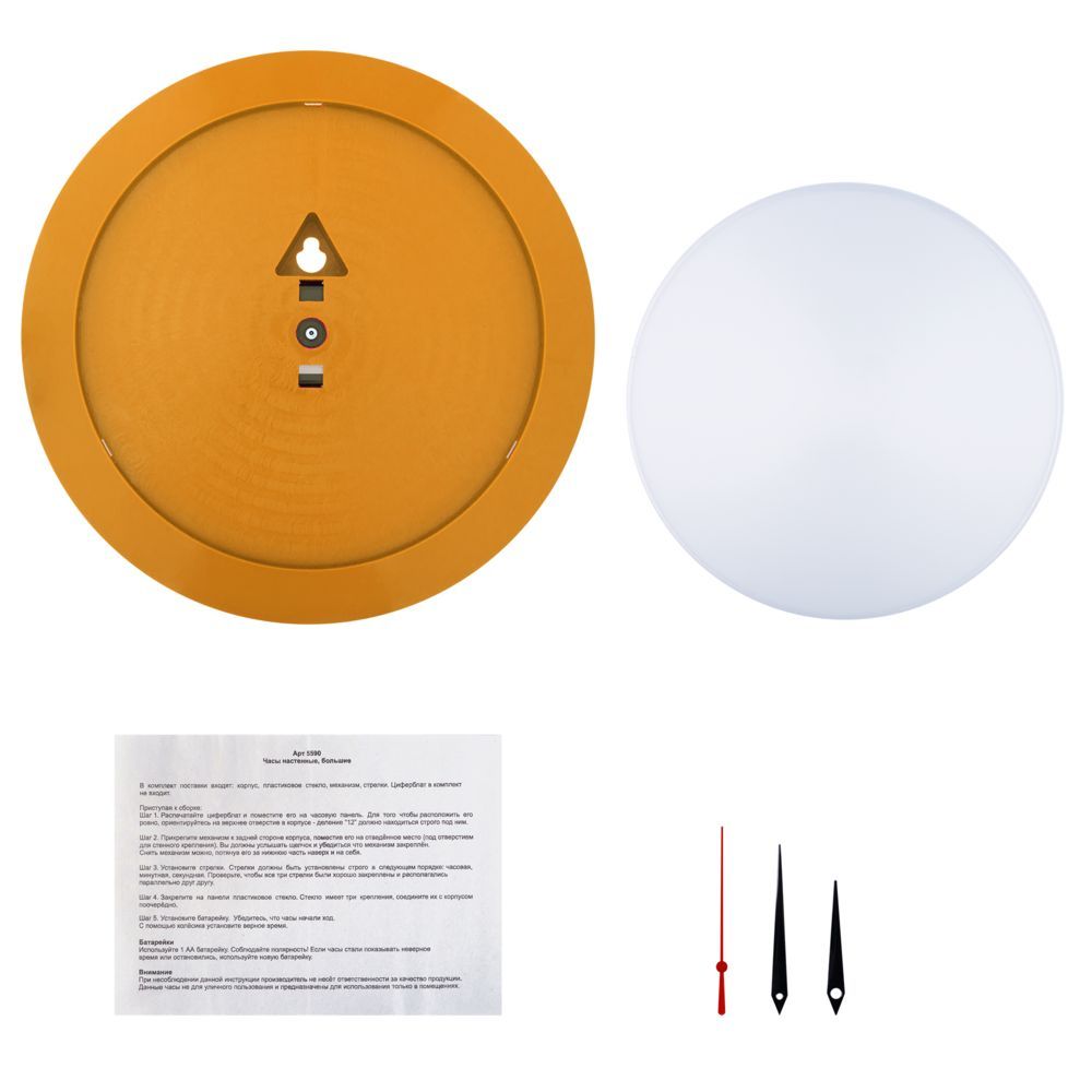Часы поставляются в разобранном виде: корпус, крышка, стрелки, механизм и индивидуальная упаковка — коробка. Часовая и минутная стрелки — черного цвета, секундная — красного цвета.