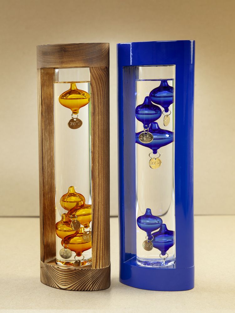 Любопытный термометр, изобретенный великим Галилео Галилеем, который первым обнаружил, что плотность жидкости увеличивается при снижении температуры и уменьшается при ее повышении.