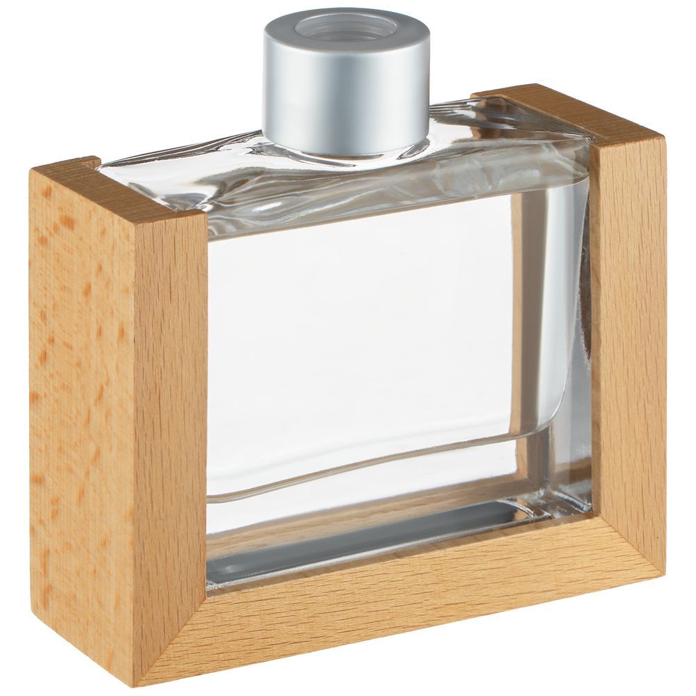 Изящный стеклянный флакон в обрамлении натурального дерева станет стильным элементом декора.