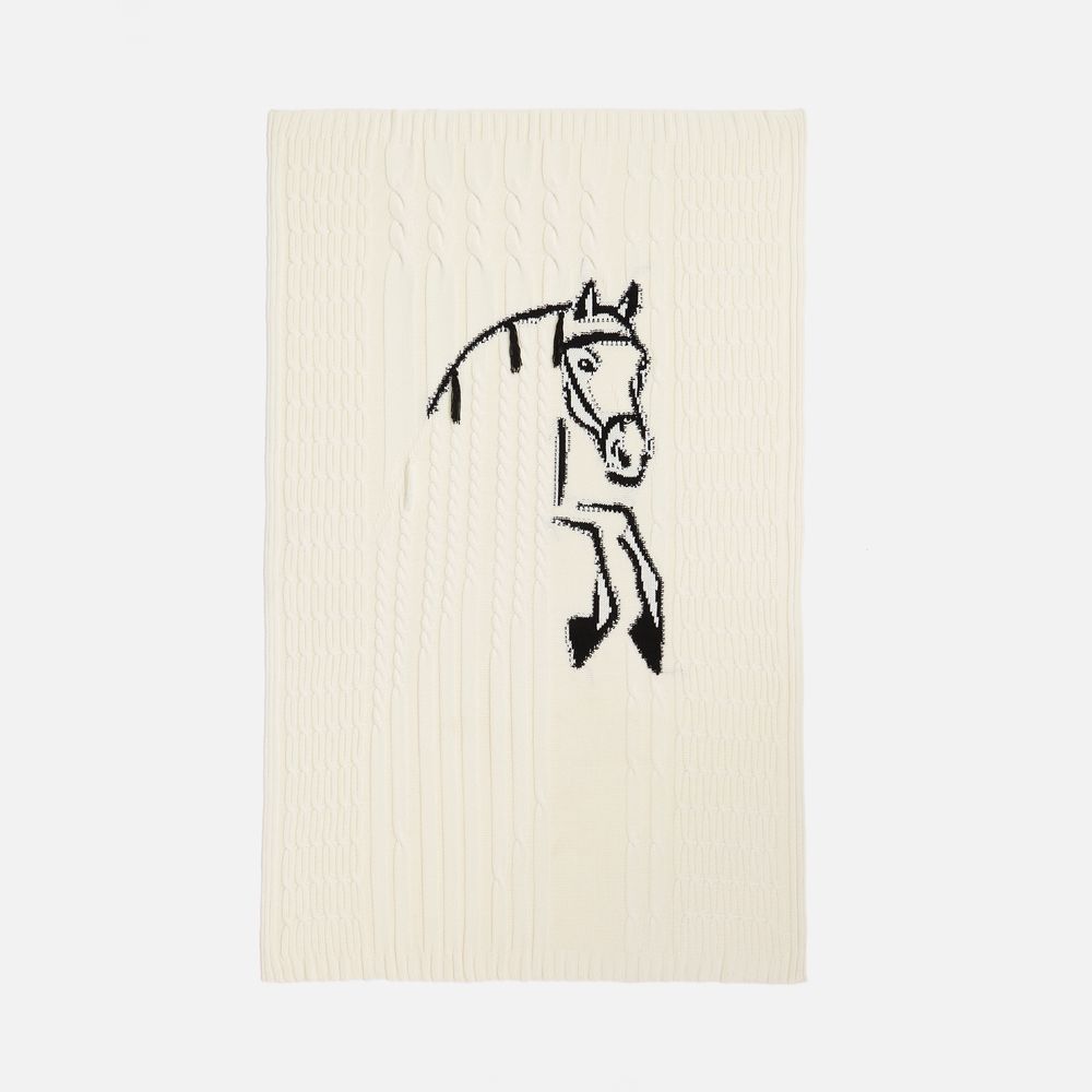 Лошадка на пледе будто встала на дыбы с согнутыми передними ногами, то есть в стойку курбет — бойкая и игривая. Дополнительного очарования и объема добавляют ей аккуратные кисточки на гриве. Словно незаконченный карандашный рисунок или эскиз, лошадь контрастно выделяется на общем белом фоне, символизируя полную готовность к грядущему году и его вызовам. А как еще встречать Новый год, если не с радостью и бурным желанием устремиться вперед?