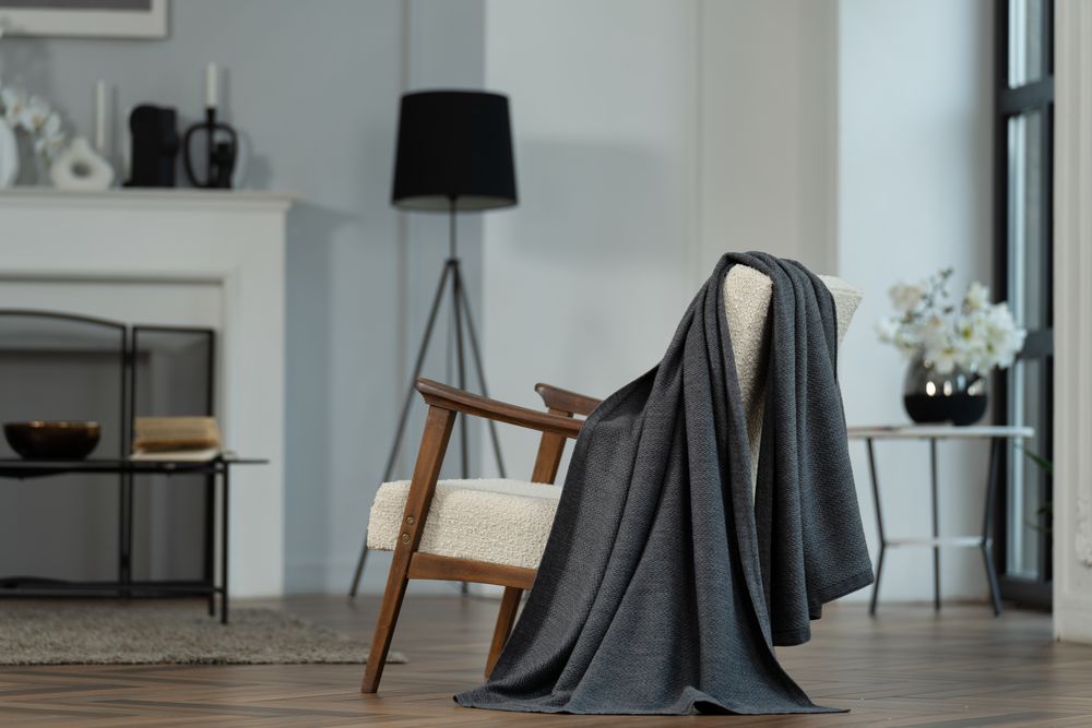 Плед из полушерстяной пряжи, поэтому прекрасно согревает и неприхотлив в уходе.