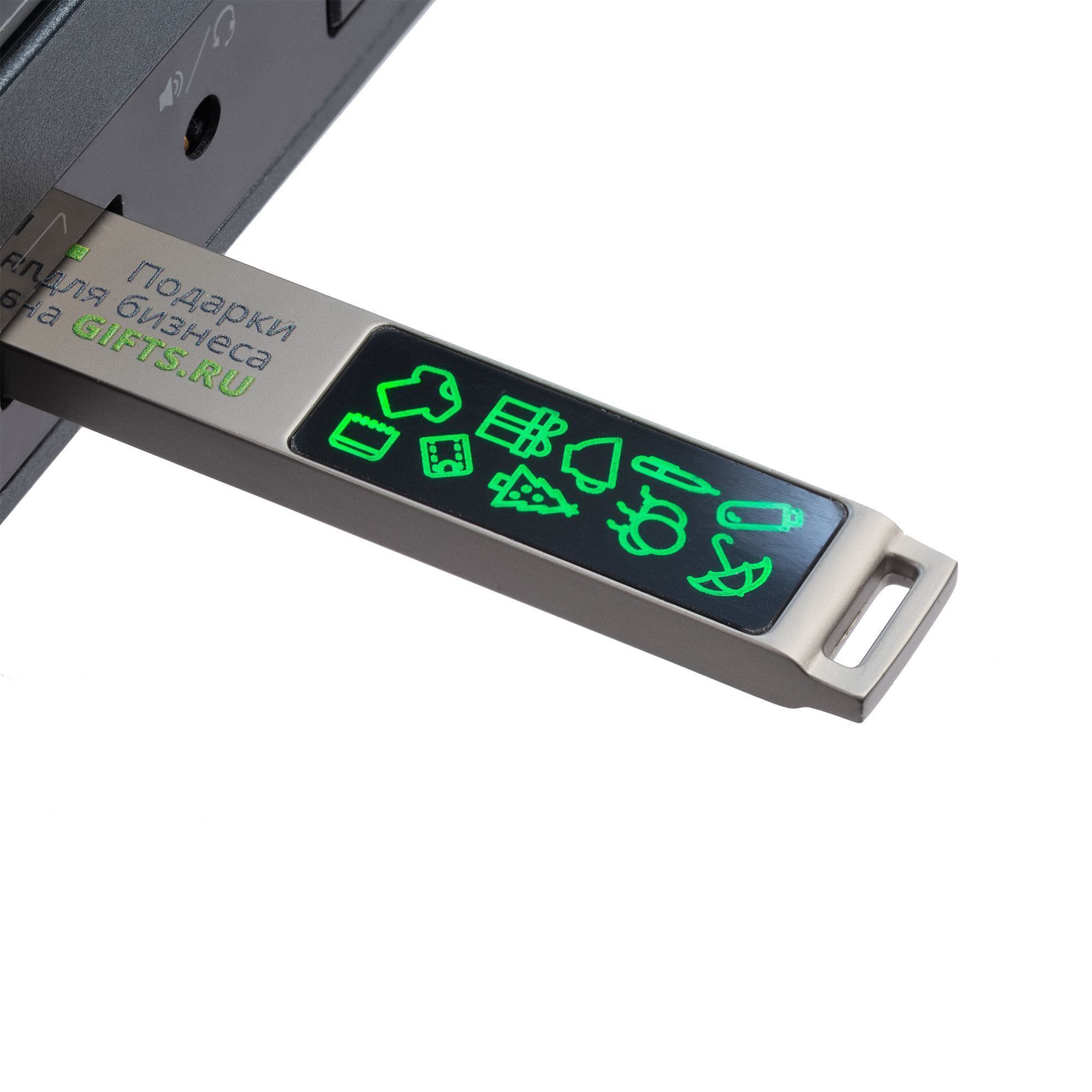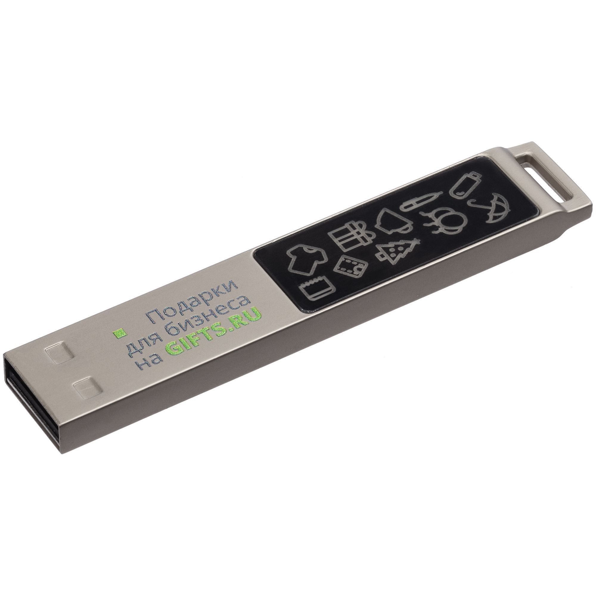 Флешка в тонком металлическом корпусе с пластиковой самоклеящейся шильдой в комплекте. Благодаря встроенной в корпус светодиодной матрице, логотип, выполненный на шильде методом лазерной гравировки, подсвечивается белым, красным, зеленым или синим в зависимости от выбранной модели.