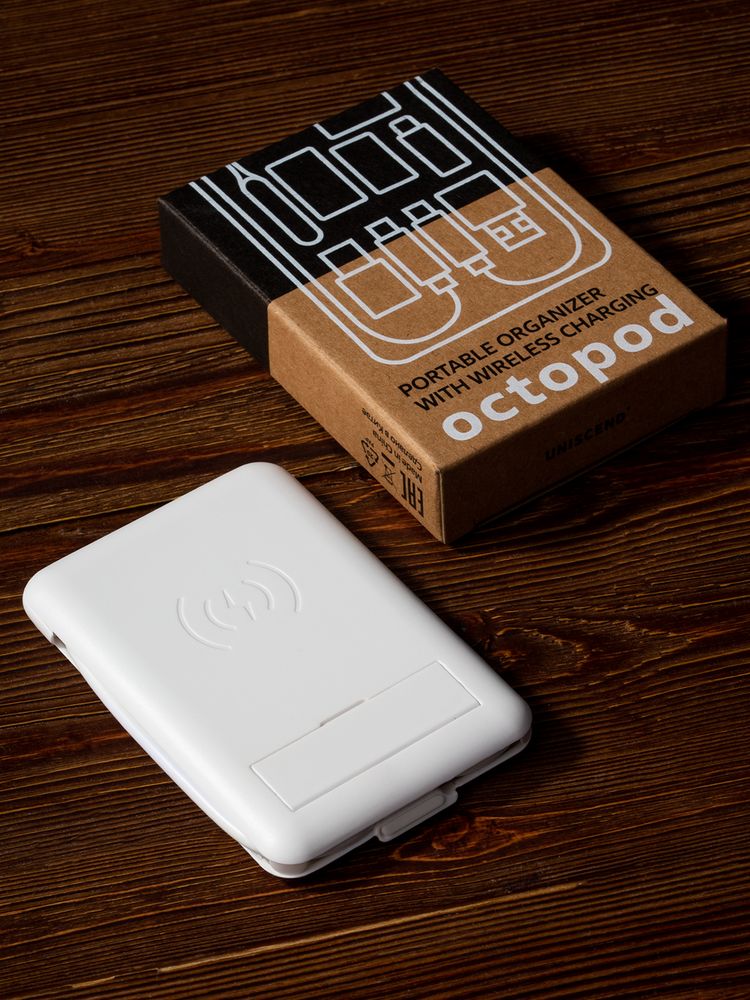 Octopod — компактная станция для беспроводной зарядки, которая укомплектована ключом для слота SIM-карты, кабелем с разъемами USB Type-C-Type-C, переходниками на разъемы lightning, USB Type-A и micro USB.