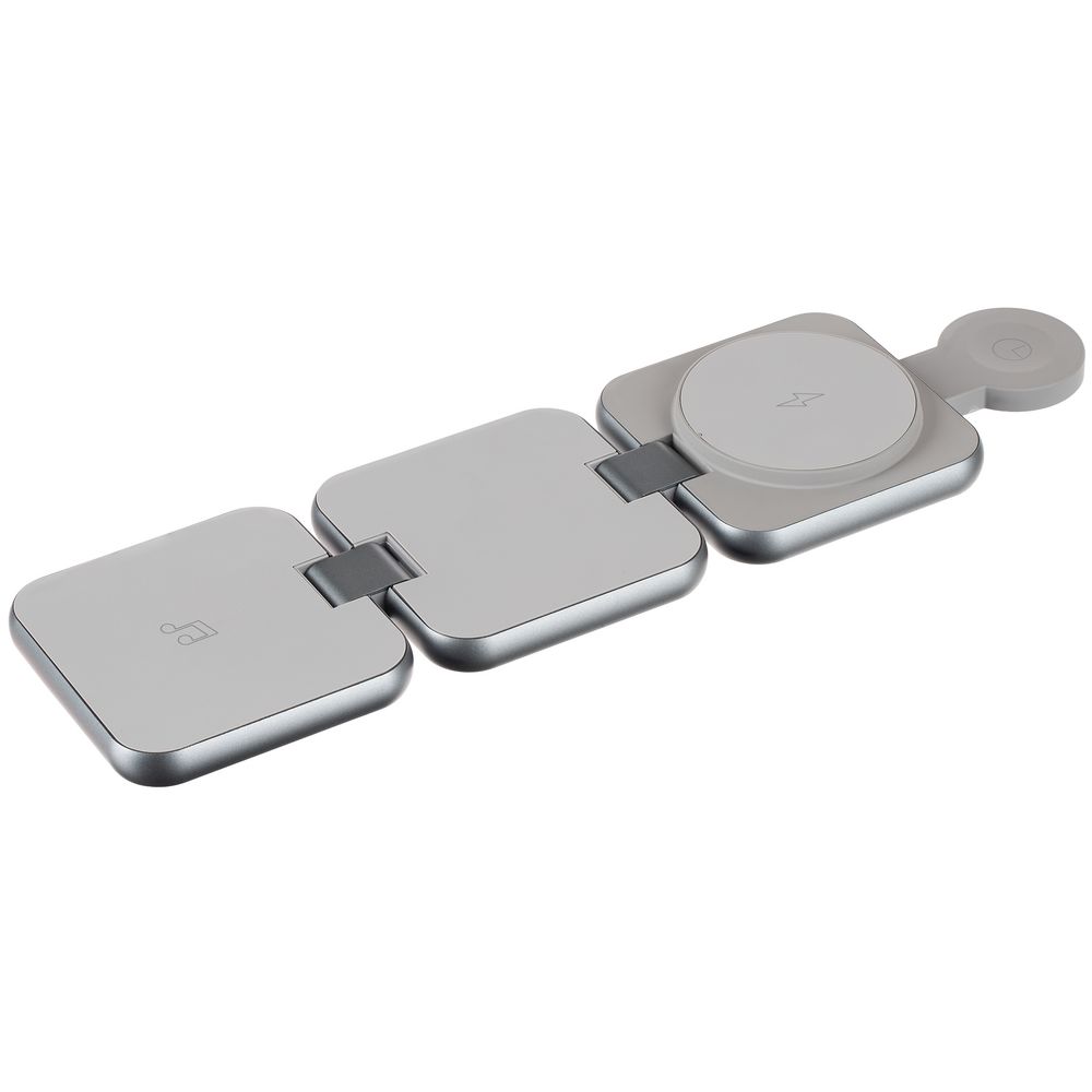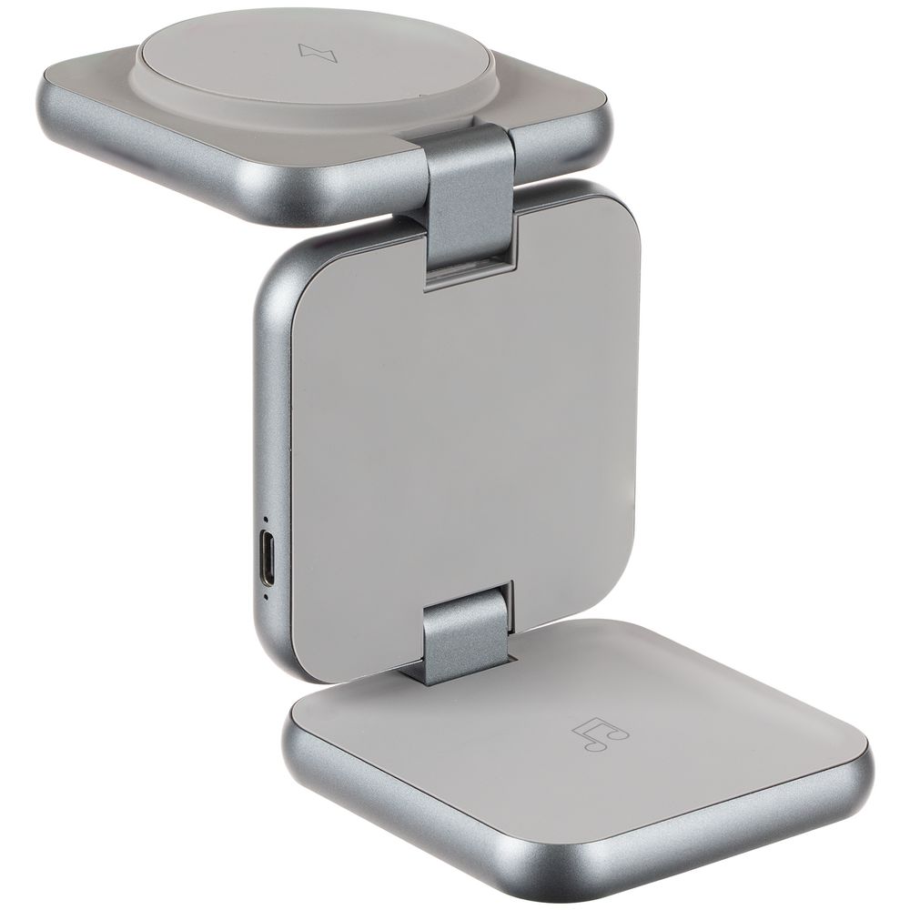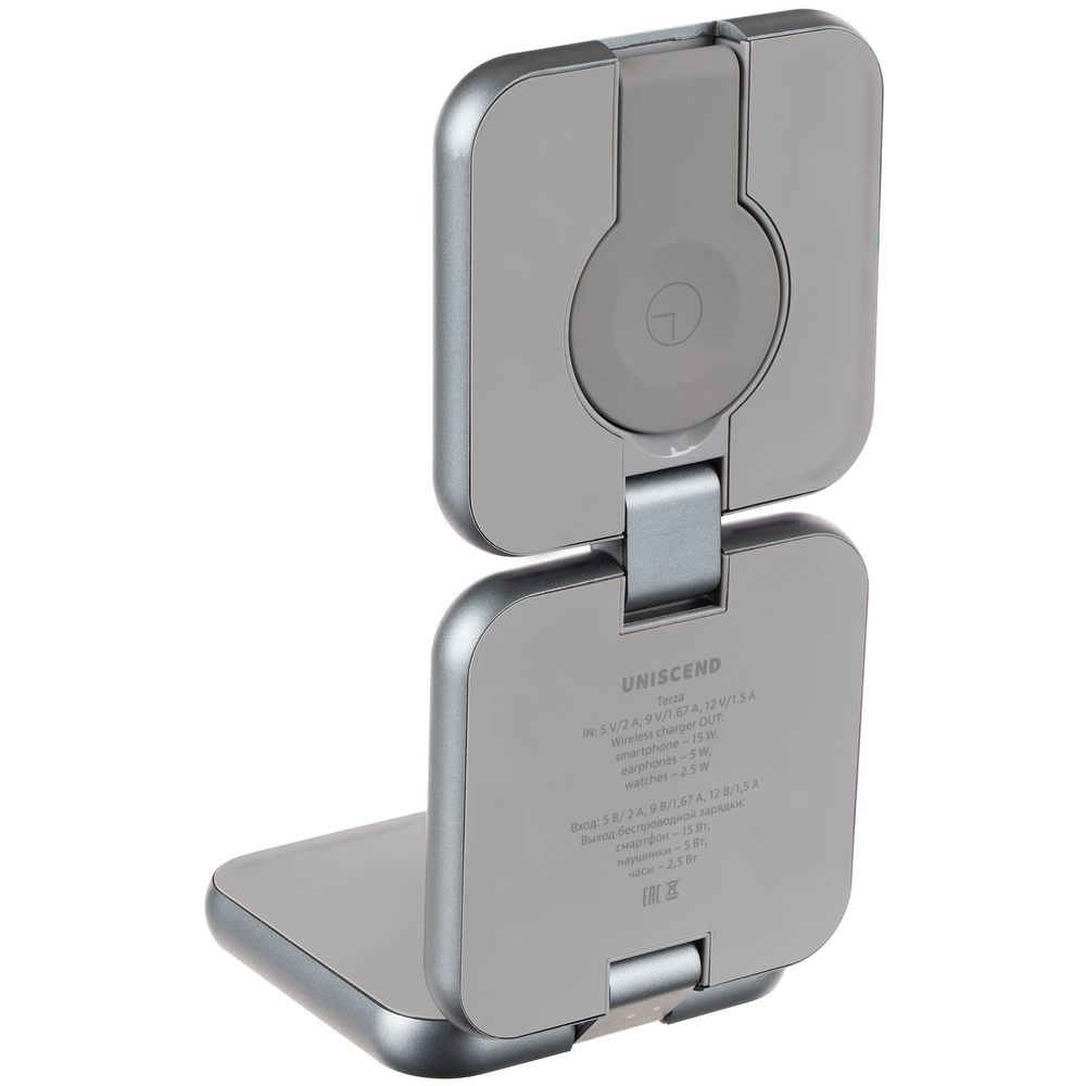 Terza — компактное устройство для беспроводной зарядки сразу трех устройств. Станция легко складывается в стильный миниатюрный куб, поэтому ее удобно использовать и в офисе, и в дороге, Продуманная конструкция позволяет фиксировать пластины в любом положении, в том числе свернуть их в удобную подставку для телефона.