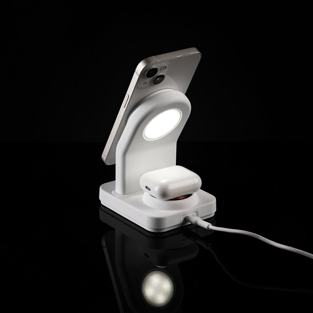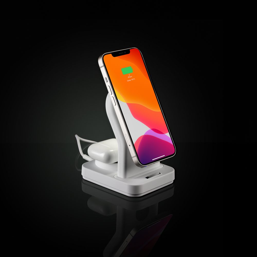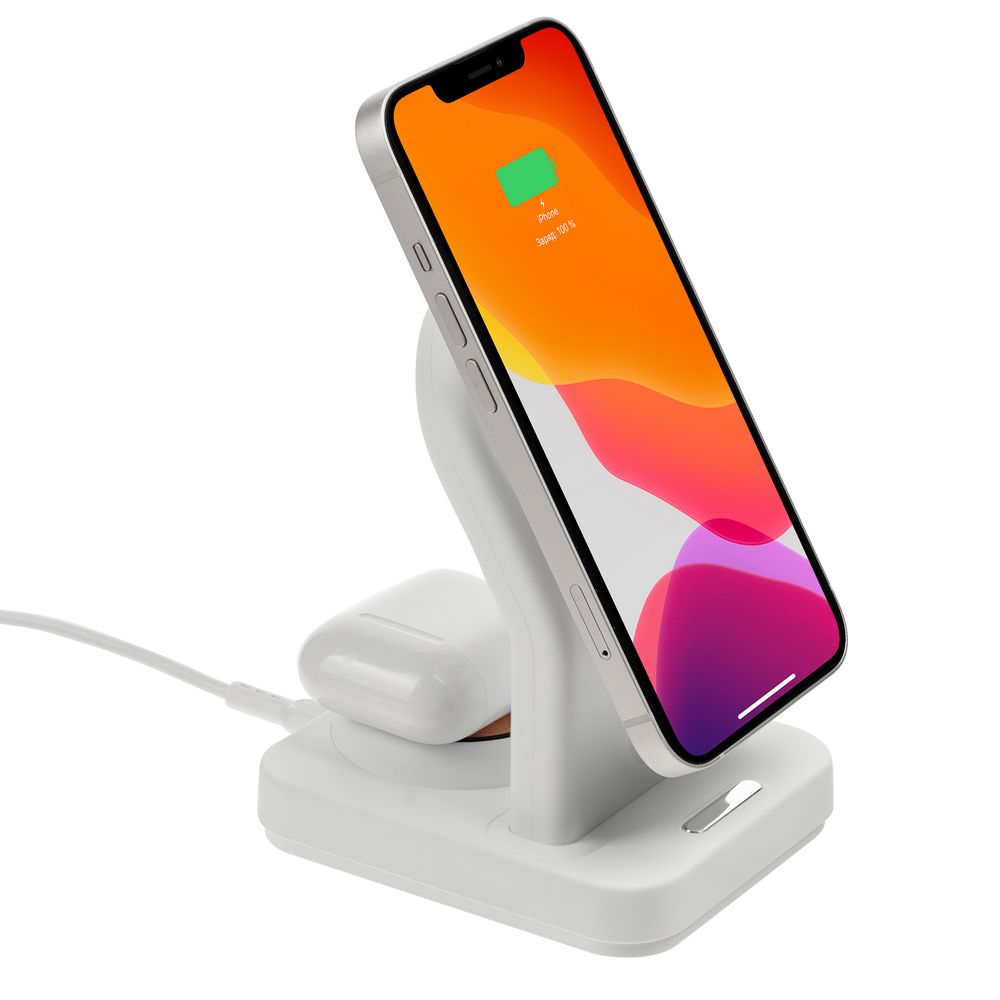 iPhone 12–15 c магнитами MagSafe могут удерживаться на основной области станции. Ранние или компактные модели iPhone или смартфоны с диагональю 5,7–6" на OS Android можно оснастить специальным адаптером Magmate или чехлом со встроенным кольцевым магнитом сзади.