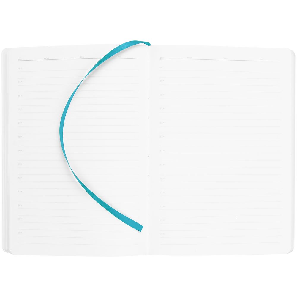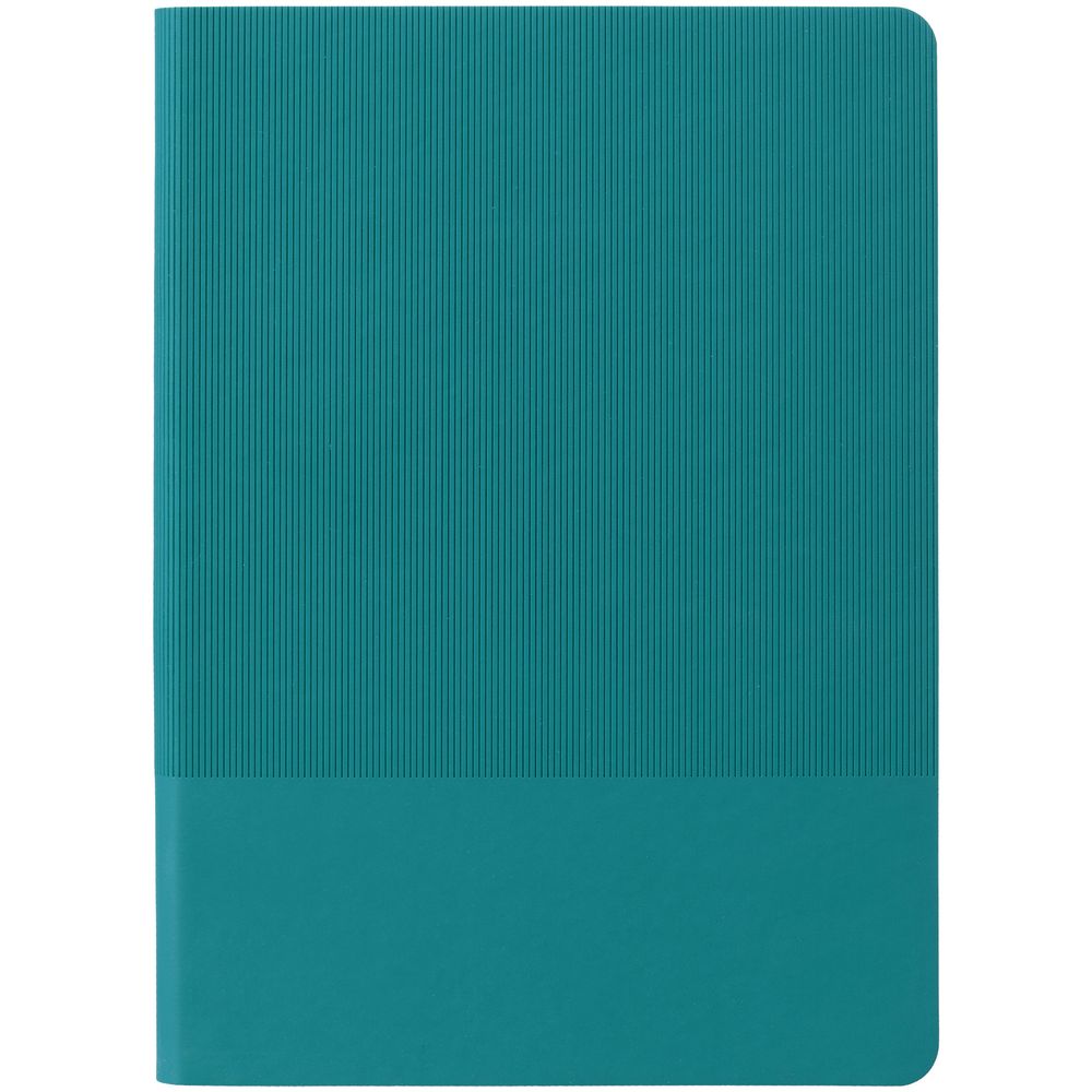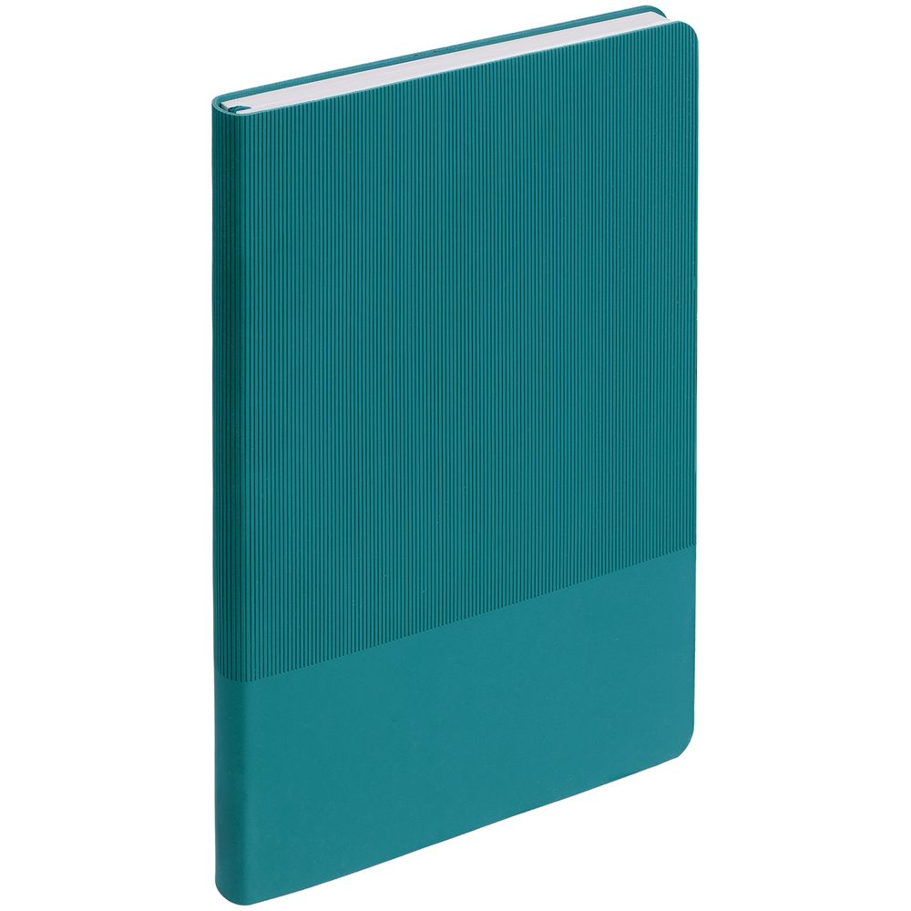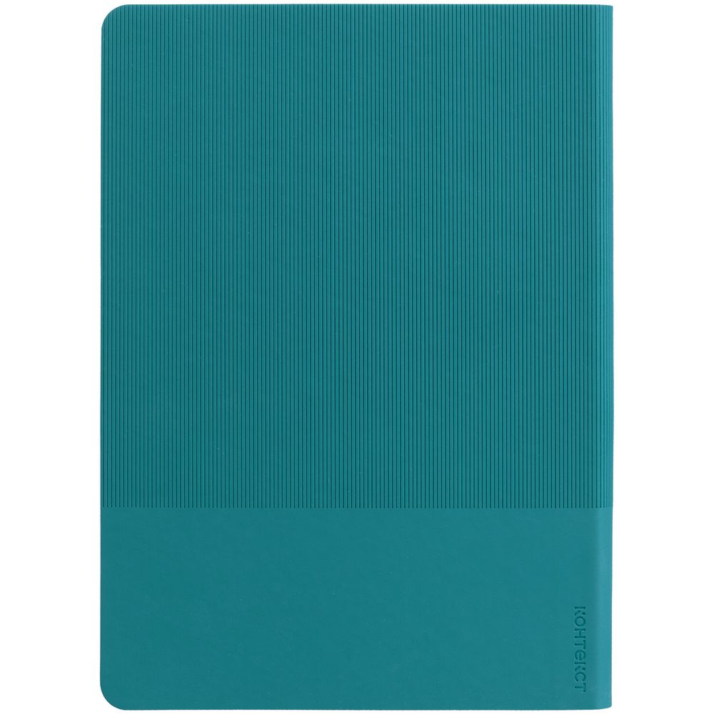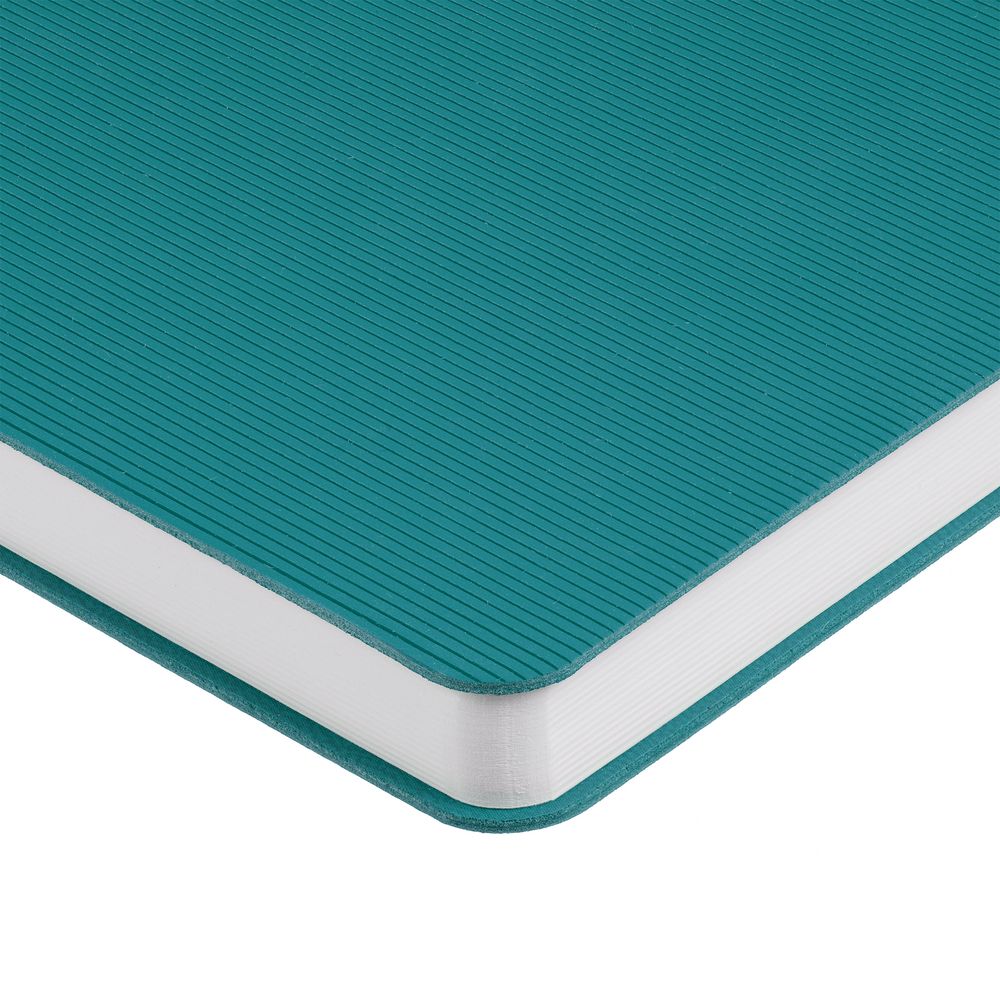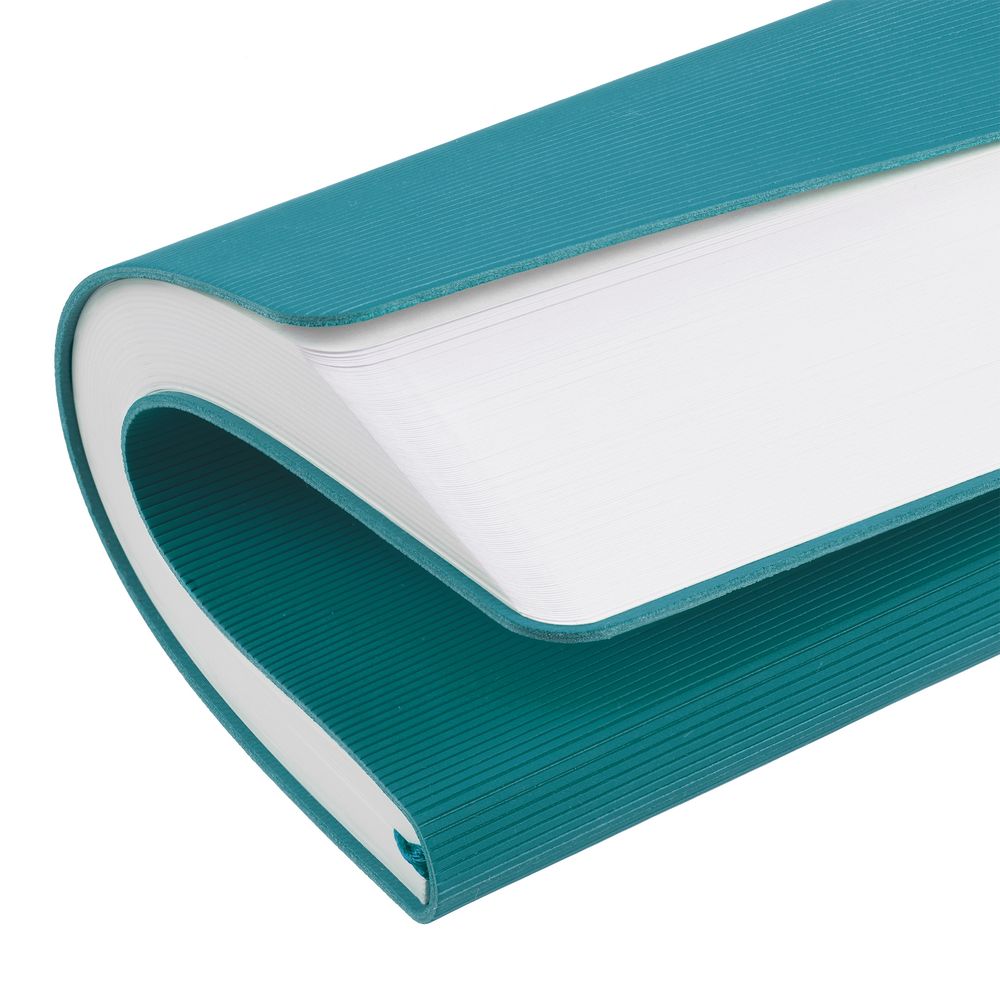Ежедневник с гибкой обложкой выполнен из материала Soft Touch, цвет морской волны II и Latte, цвет морской волны (внутренний материал); дополнен ляссе бирюзового цвета и фактурным тиснением обложки.