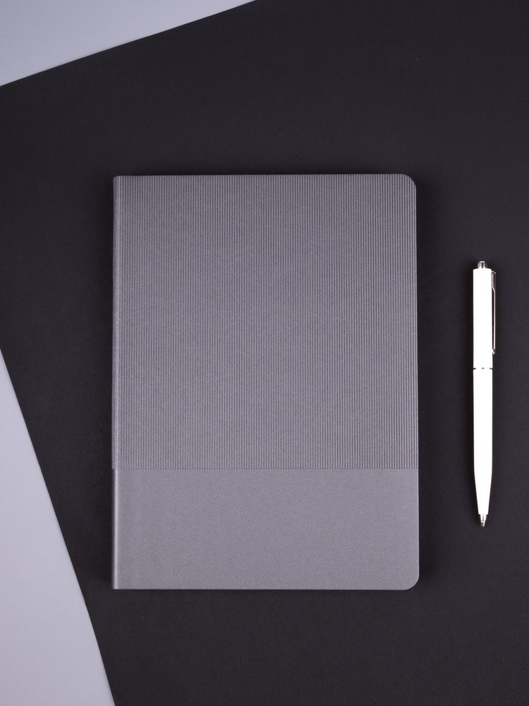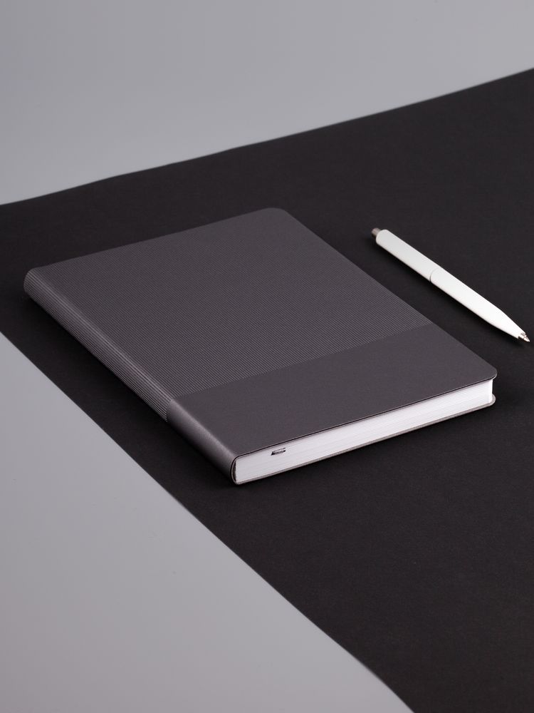 Ежедневник с гибкой обложкой выполнен из материала Soft Touch Perl, серый СС и Latte, серый (внутренний материал); дополнен ляссе серого цвета и фактурным тиснением обложки.