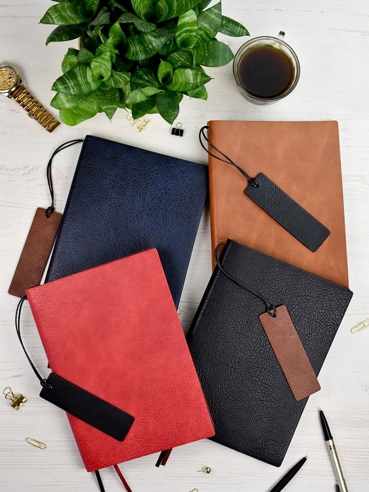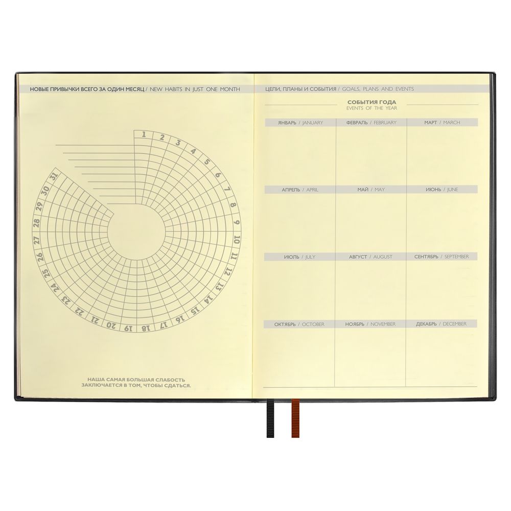 Ежедневник с гибкой обложкой и закладкой из искусственной кожи, дополнен капталом и двойным ляссе.