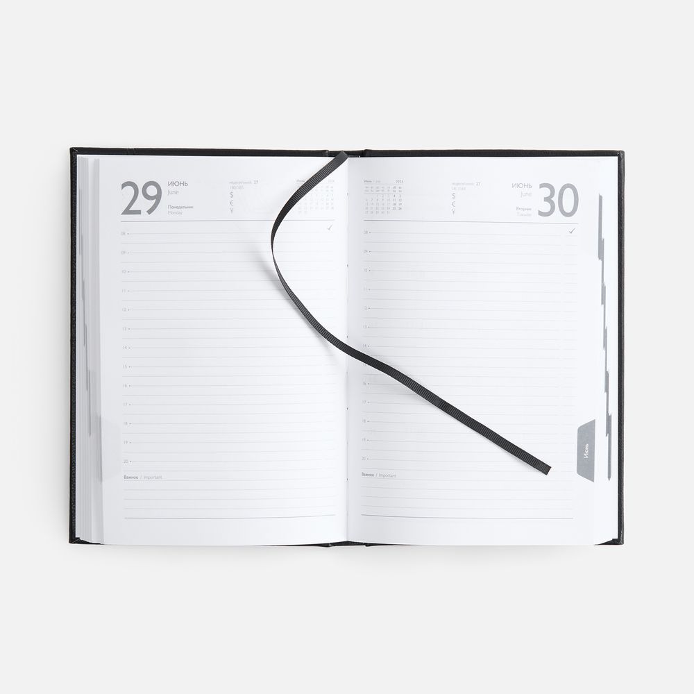 Ежедневник с твердой обложкой с поролоном из искусственной кожи, дополнен декоративной строчкой, капталом и ляссе в цвет ежедневника.