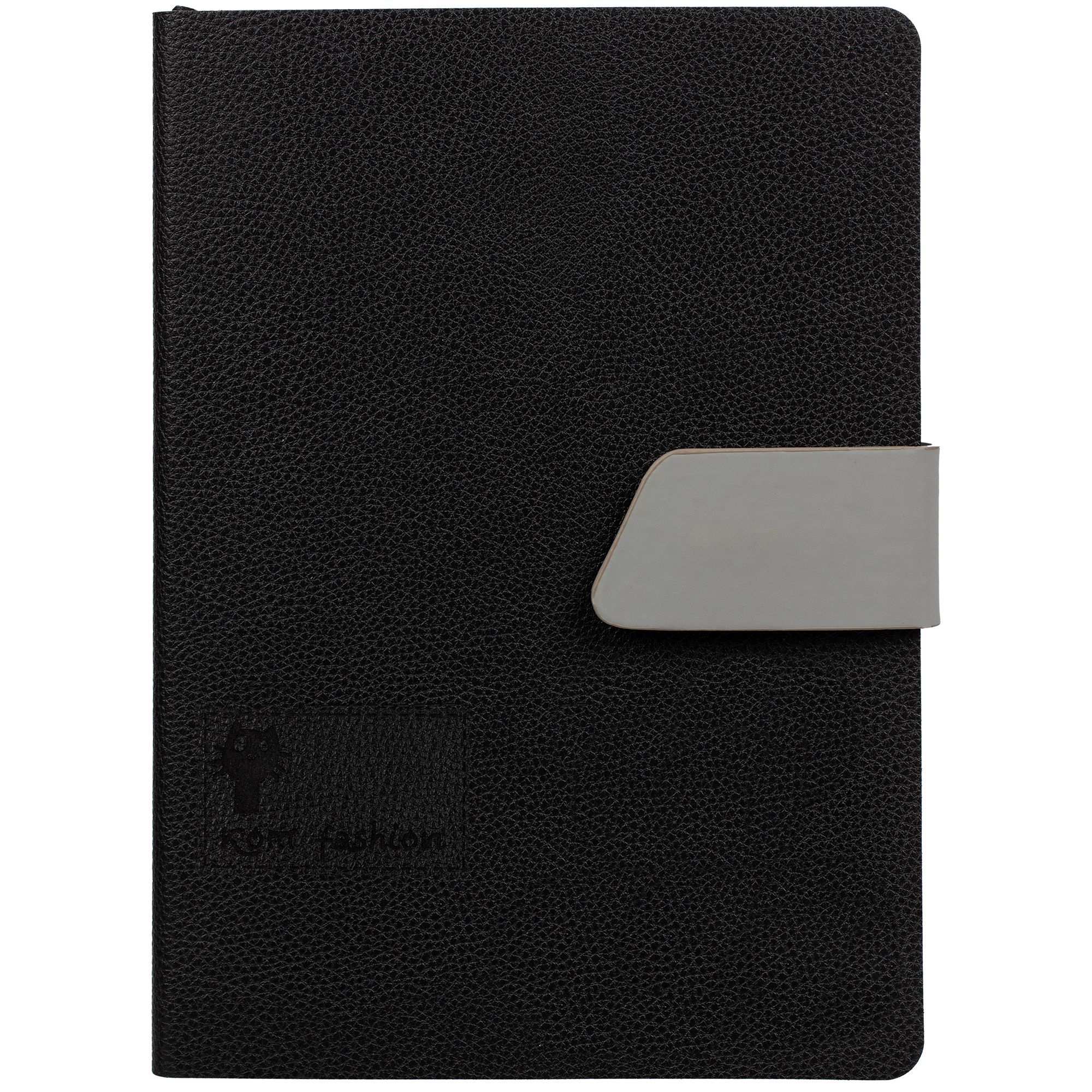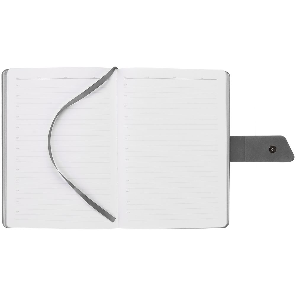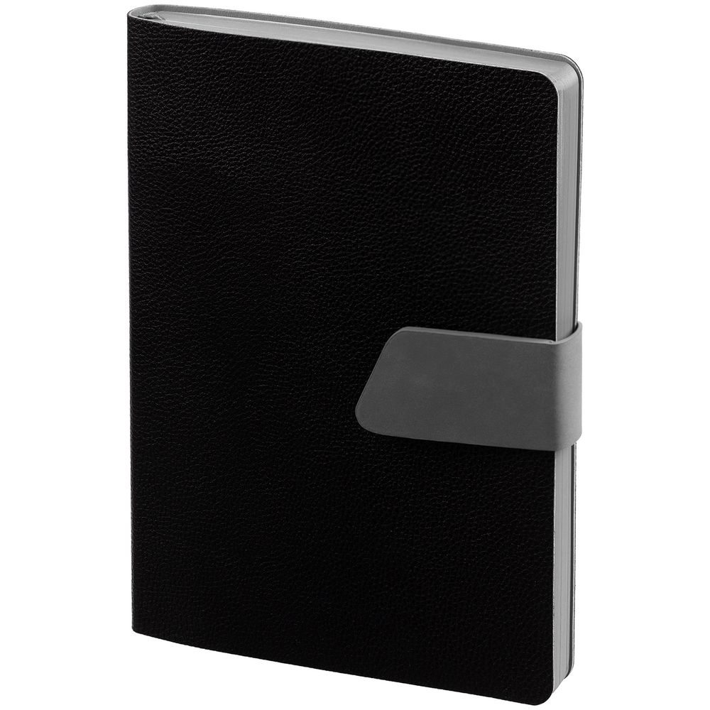 Ежедневник с гибкой обложкой, выполнен из материала La Fite, черный АА и Nubuck, серый СС, дополнен серым ляссе и хлястиком на кнопке.