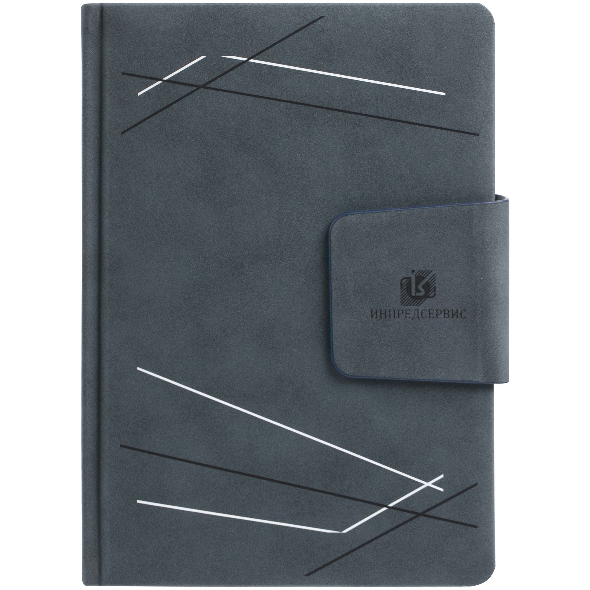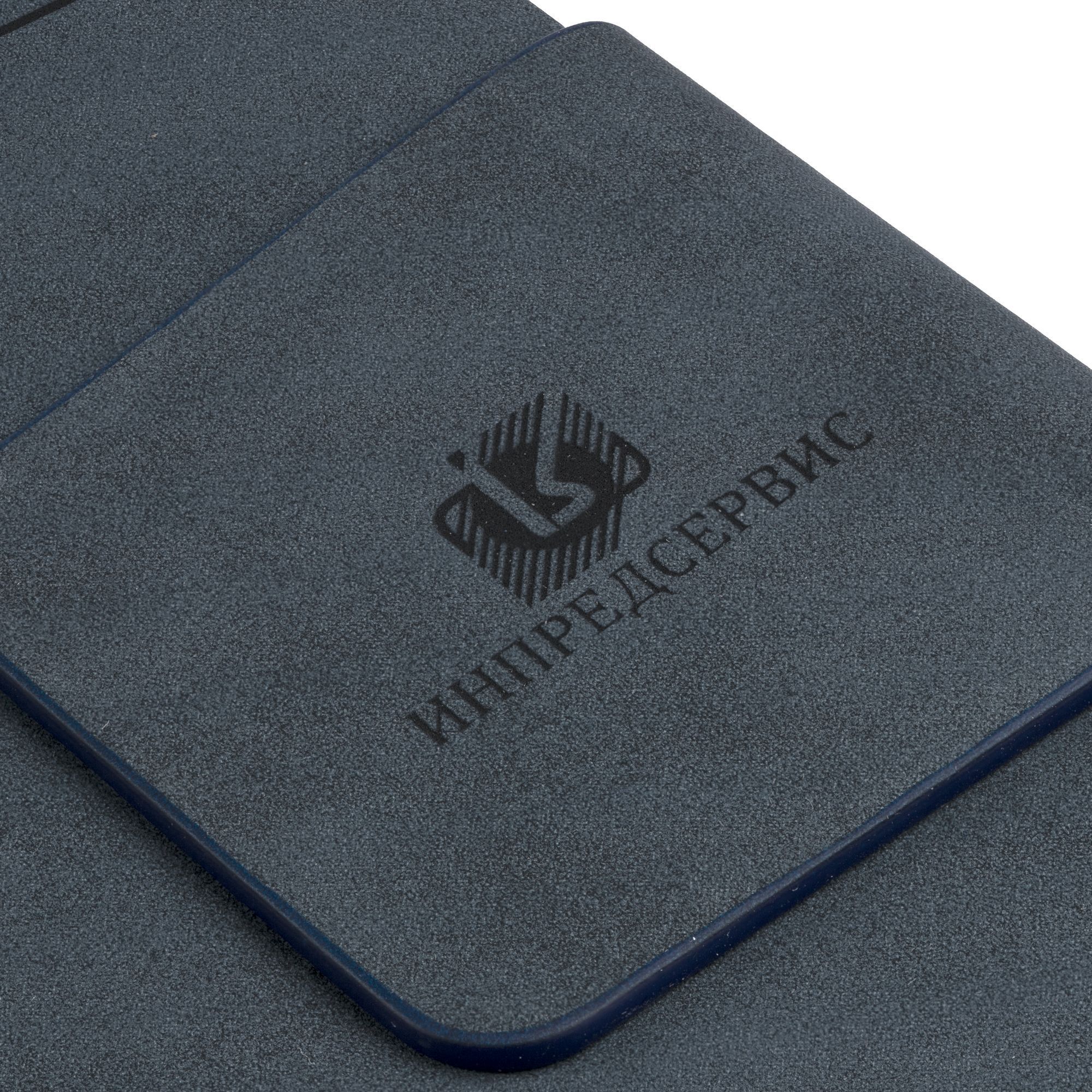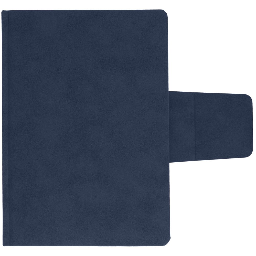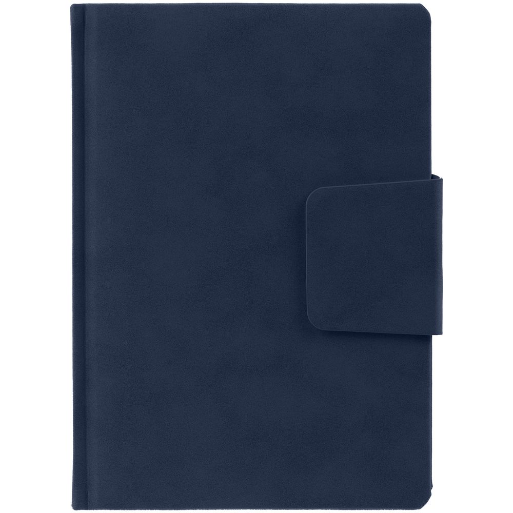 Ежедневник с твердой обложкой c поролоном, выполнен из материала Nubuck, темно-синий ХХ, дополнен капталом и ляссе темно-синего цвета. Застежка — хлястик на магните.