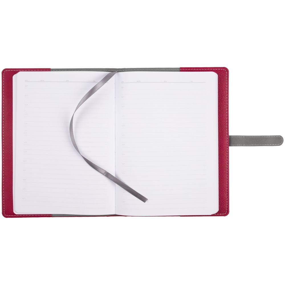 Ежедневник в мягкой суперобложке, выполнен из материала La Fite, малиновый LL, дополнен ляссе белого цвета.