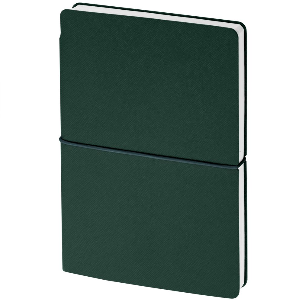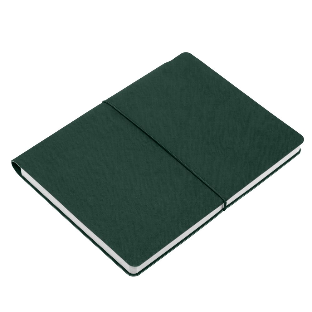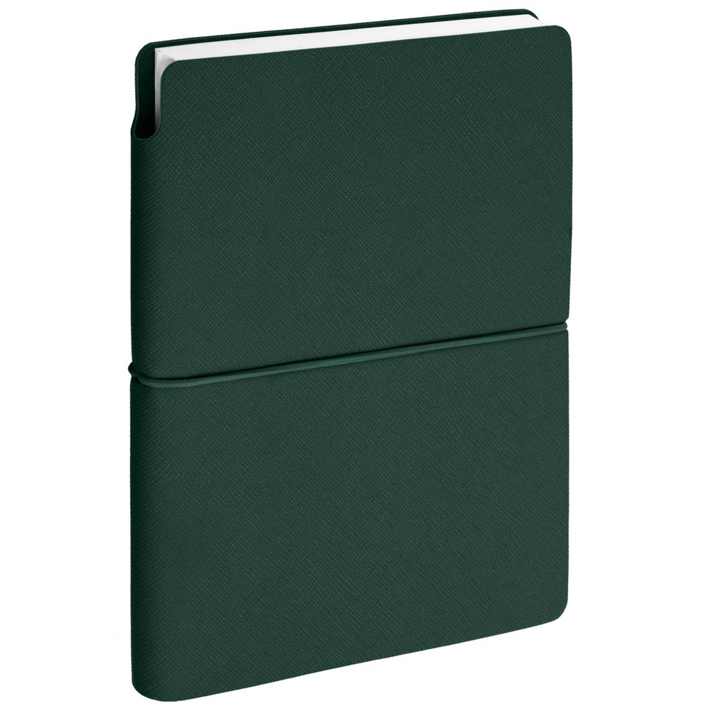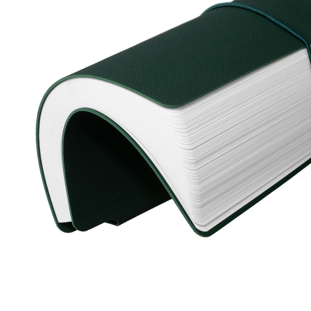 Ежедневник с гибкой обложкой выполнена из материала Nice Touch, зеленый и Latte, зеленый (внутренняя часть обложки), дополнен горизонтальной резинкой в цвет обложки. Внутри корешка — специальное место для крепления ручки размером до 15х1 см.
