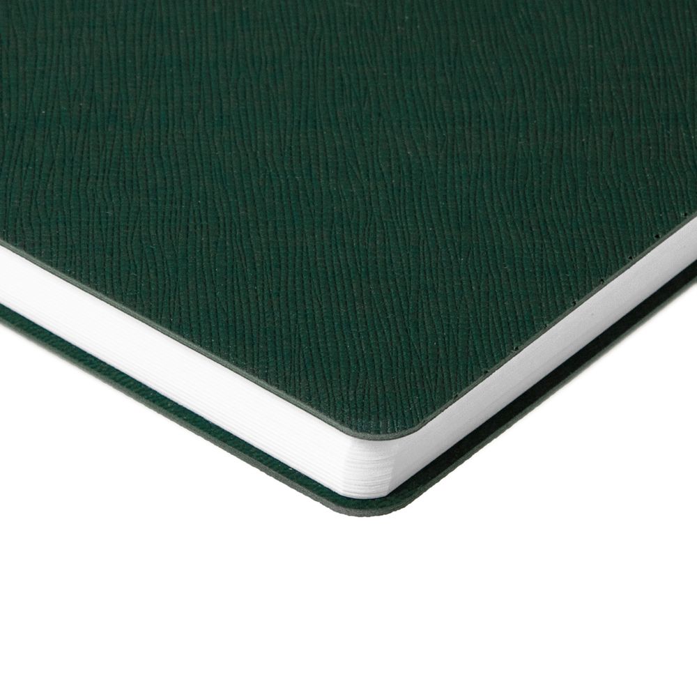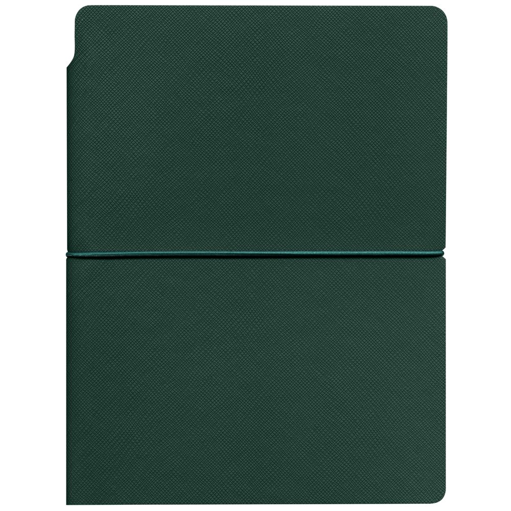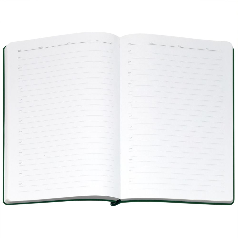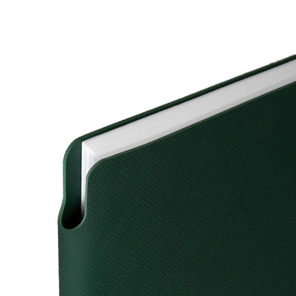 Ежедневник с гибкой обложкой выполнена из материала Nice Touch, зеленый и Latte, зеленый (внутренняя часть обложки), дополнен горизонтальной резинкой в цвет обложки. Внутри корешка — специальное место для крепления ручки размером до 15х1 см.