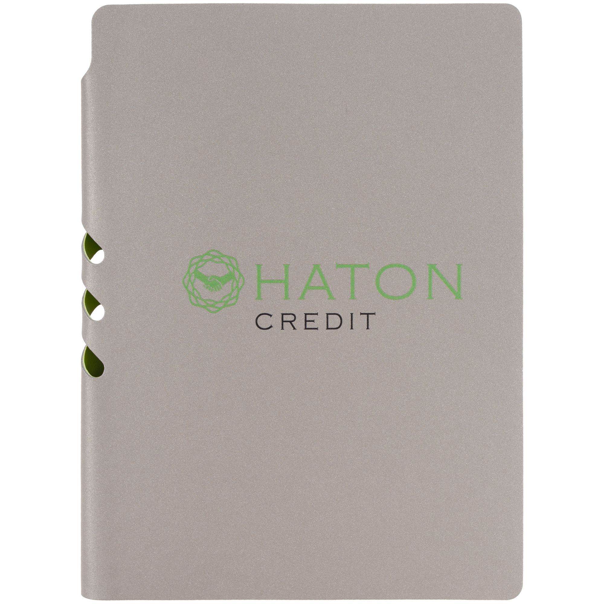 Гибкая обложка выполнена из материала Velour Melange, серый СС и Latte, светло-зеленый (внутренняя часть обложки). Внутри корешка — специальное место для крепления ручки размером до 15х0,9 см.