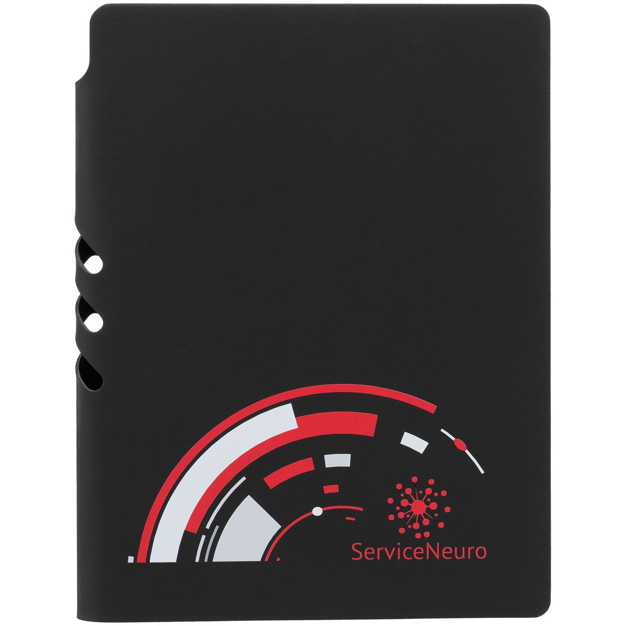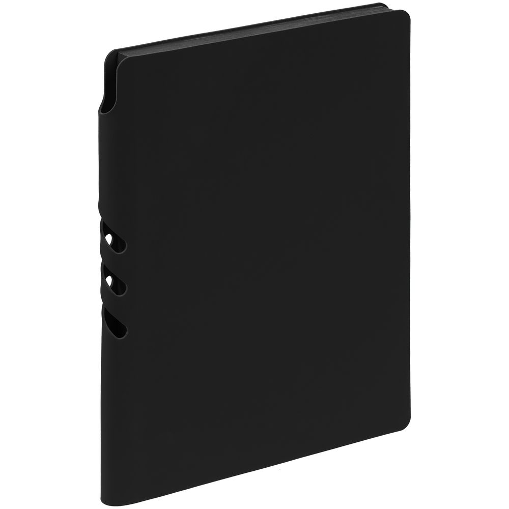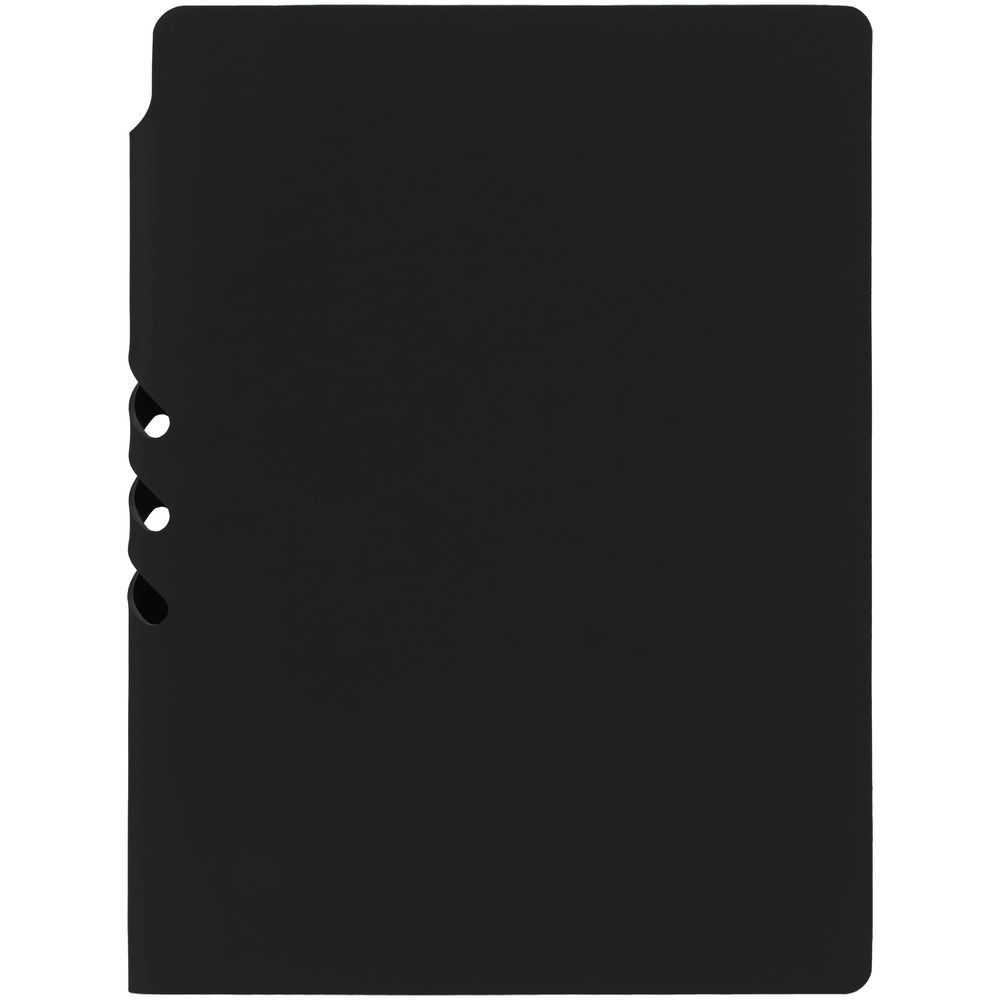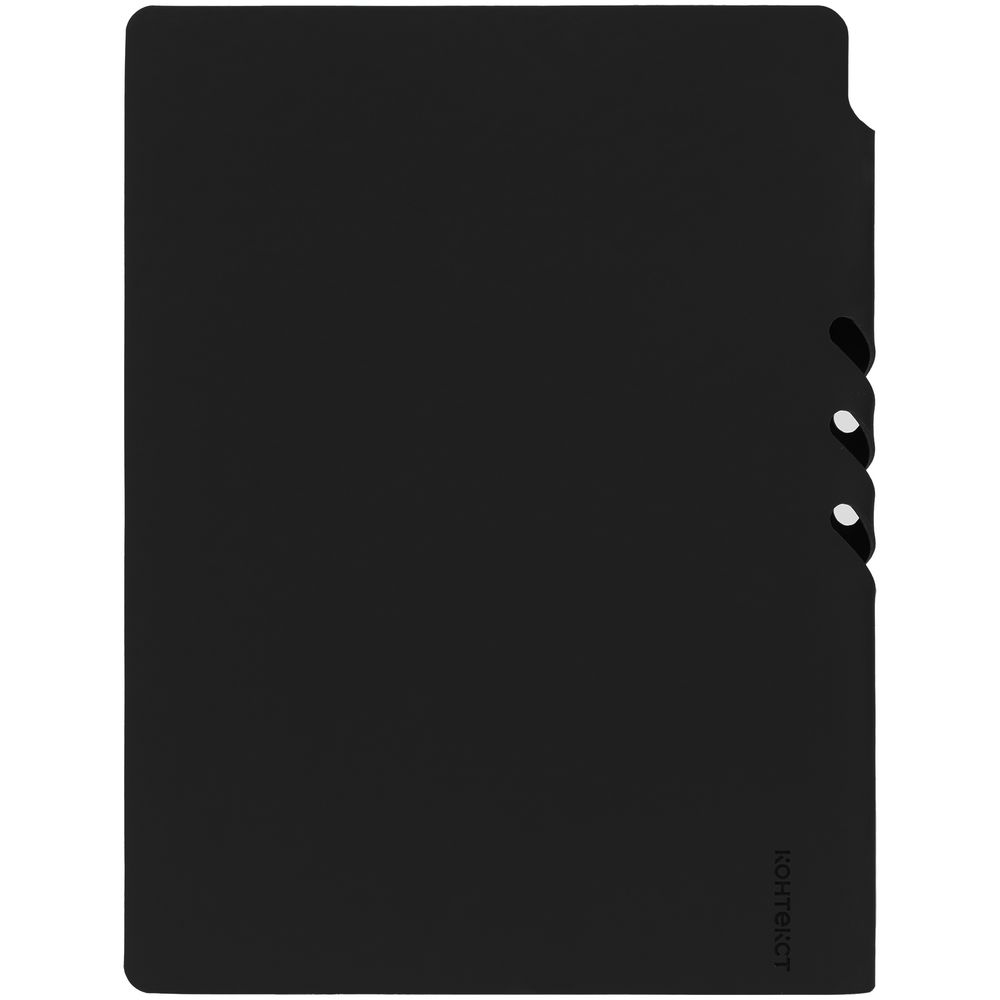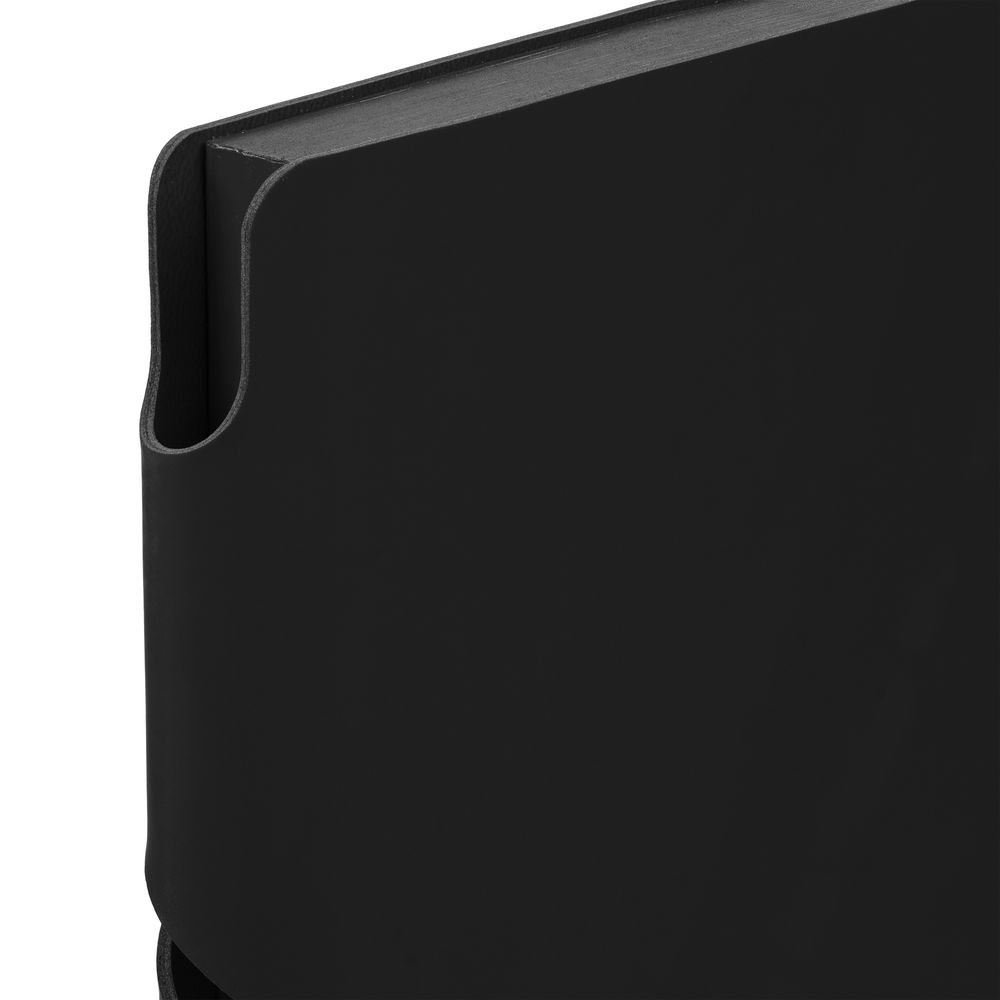 Гибкая обложка выполнена из материала Soft Touch, черный АА и Latte, черный АА (внутренняя часть обложки). Внутри корешка — специальное место для крепления ручки размером до 15х1 см.