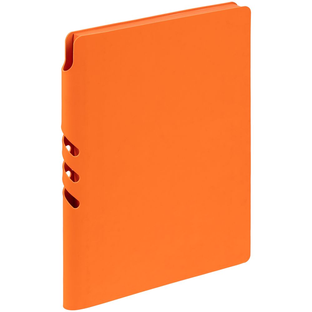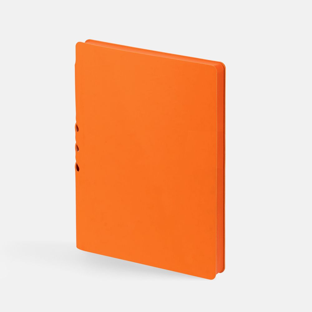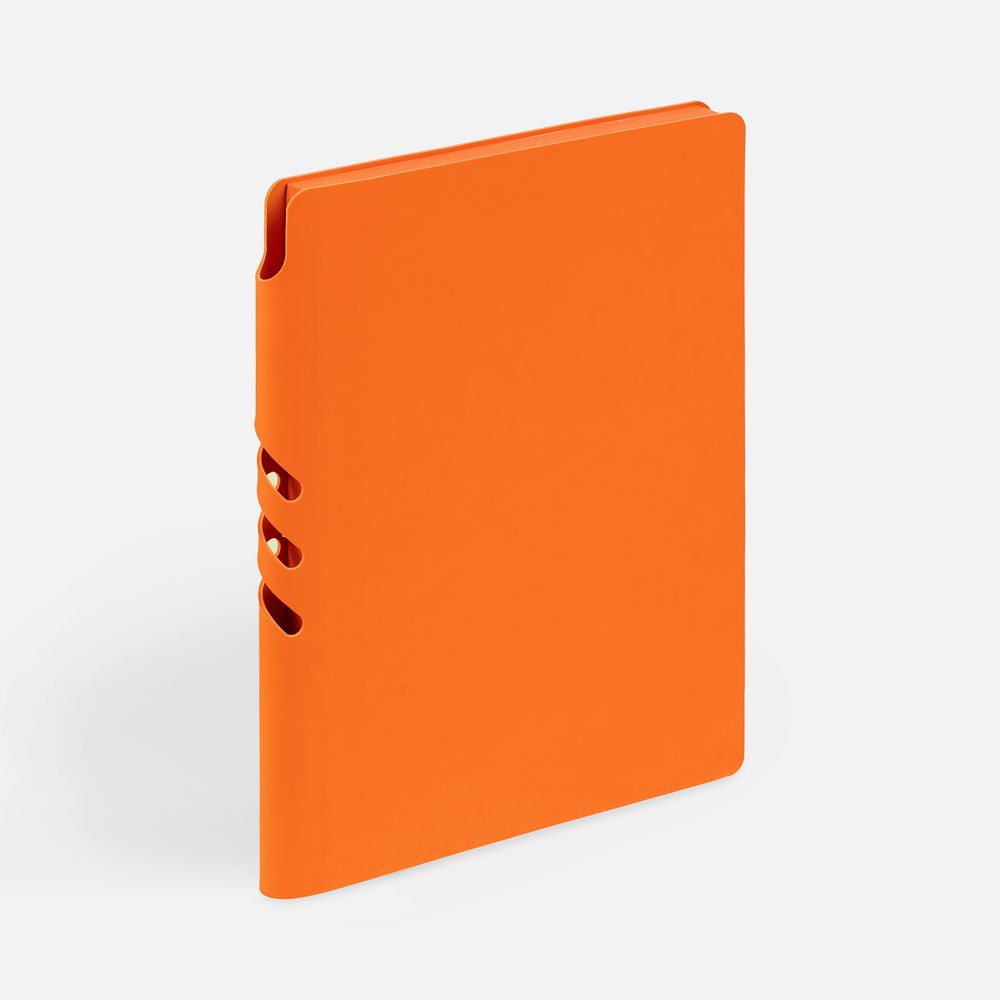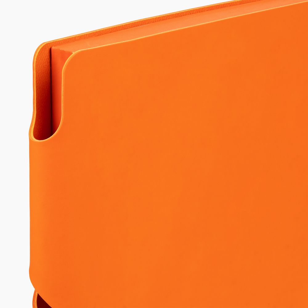 Гибкая обложка выполнена из материала Soft Touch, оранжевый OO и Latte, оранжевый OO (внутренняя часть обложки). Внутри корешка — специальное место для крепления ручки размером до 15х1 см.