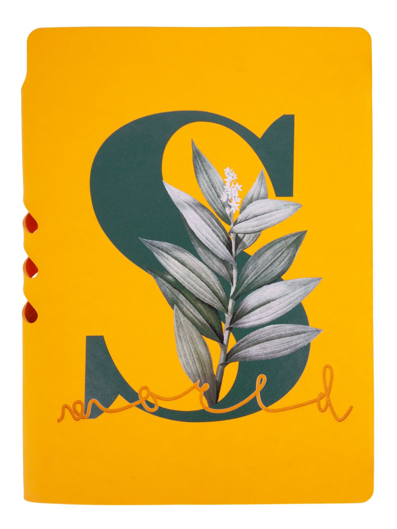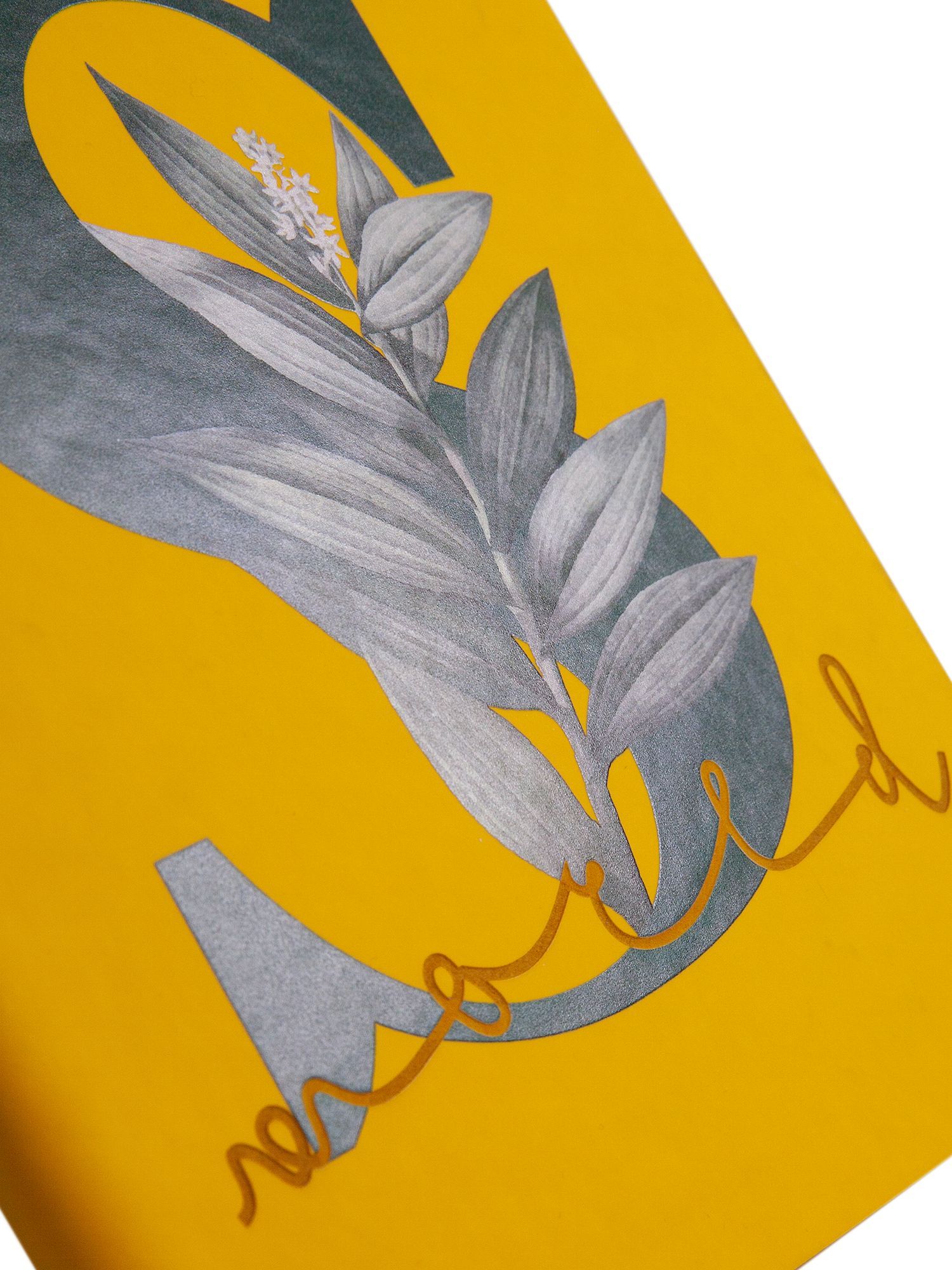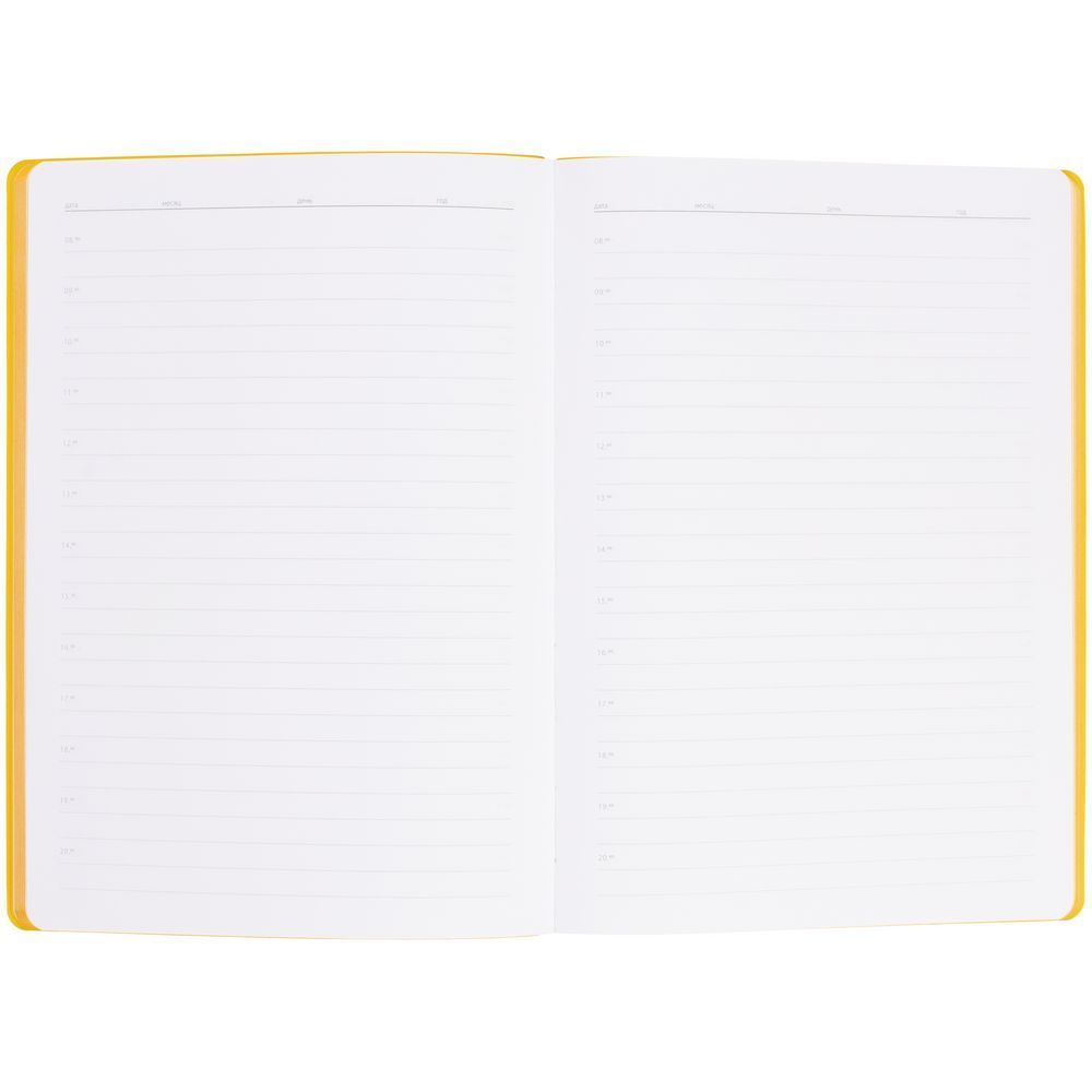Гибкая обложка выполнена из материала Soft Touch, желтый КК и Latte, желтый КК (внутренняя часть обложки). Внутри корешка — специальное место для крепления ручки размером до 15х1 см.