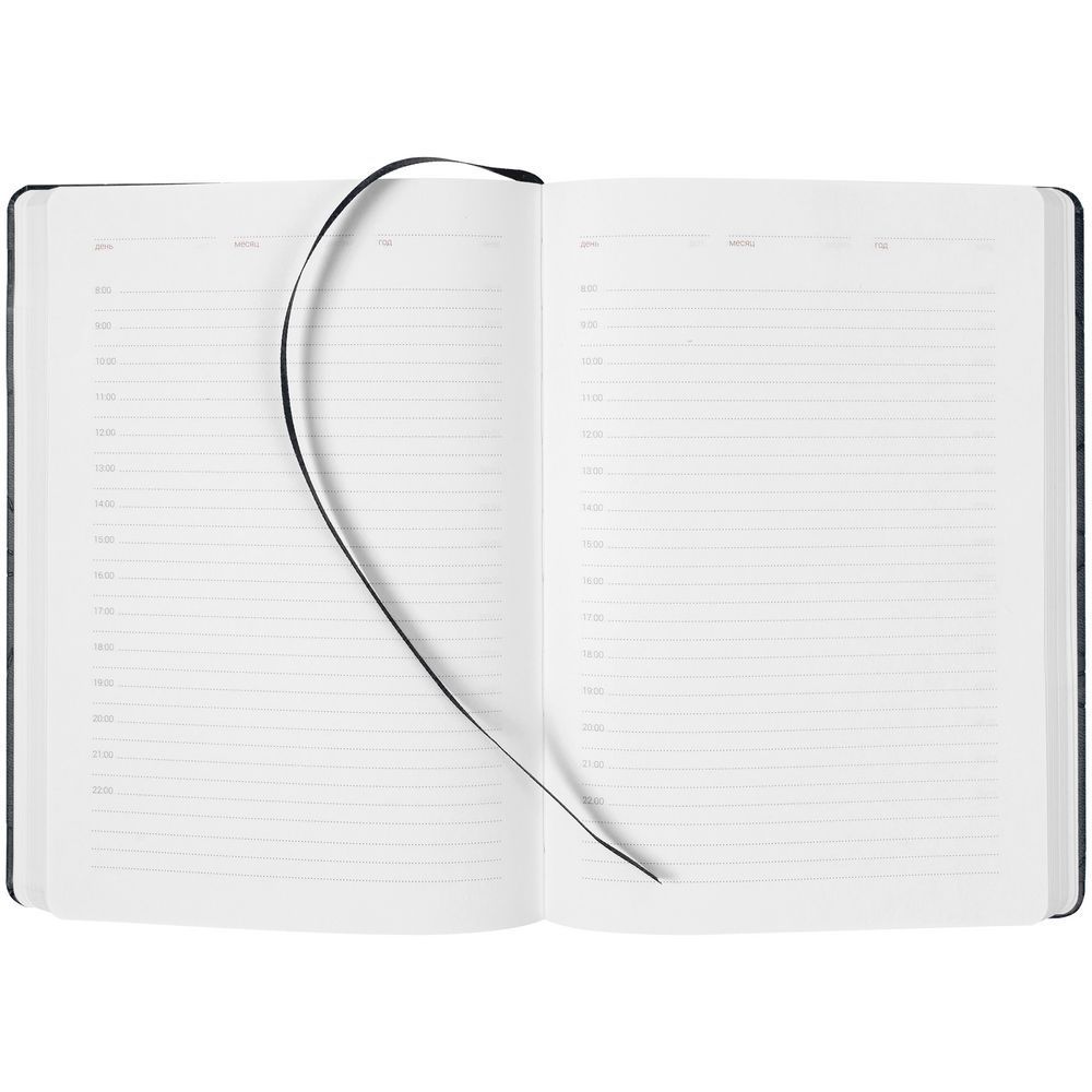 Ежедневник с твердой обложкой, выполнен из материала Brand, черный АА, с тиснением и выборочным УФ-лаком. Дополнен ляссе в цвет обложки.