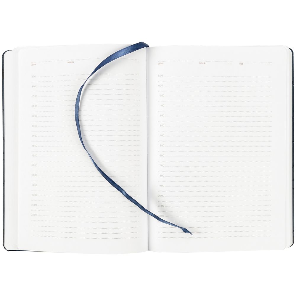 Ежедневник с твердой обложкой, выполнен из материала Brand, синий НН, с тиснением и выборочным УФ-лаком. Дополнен ляссе в цвет обложки.