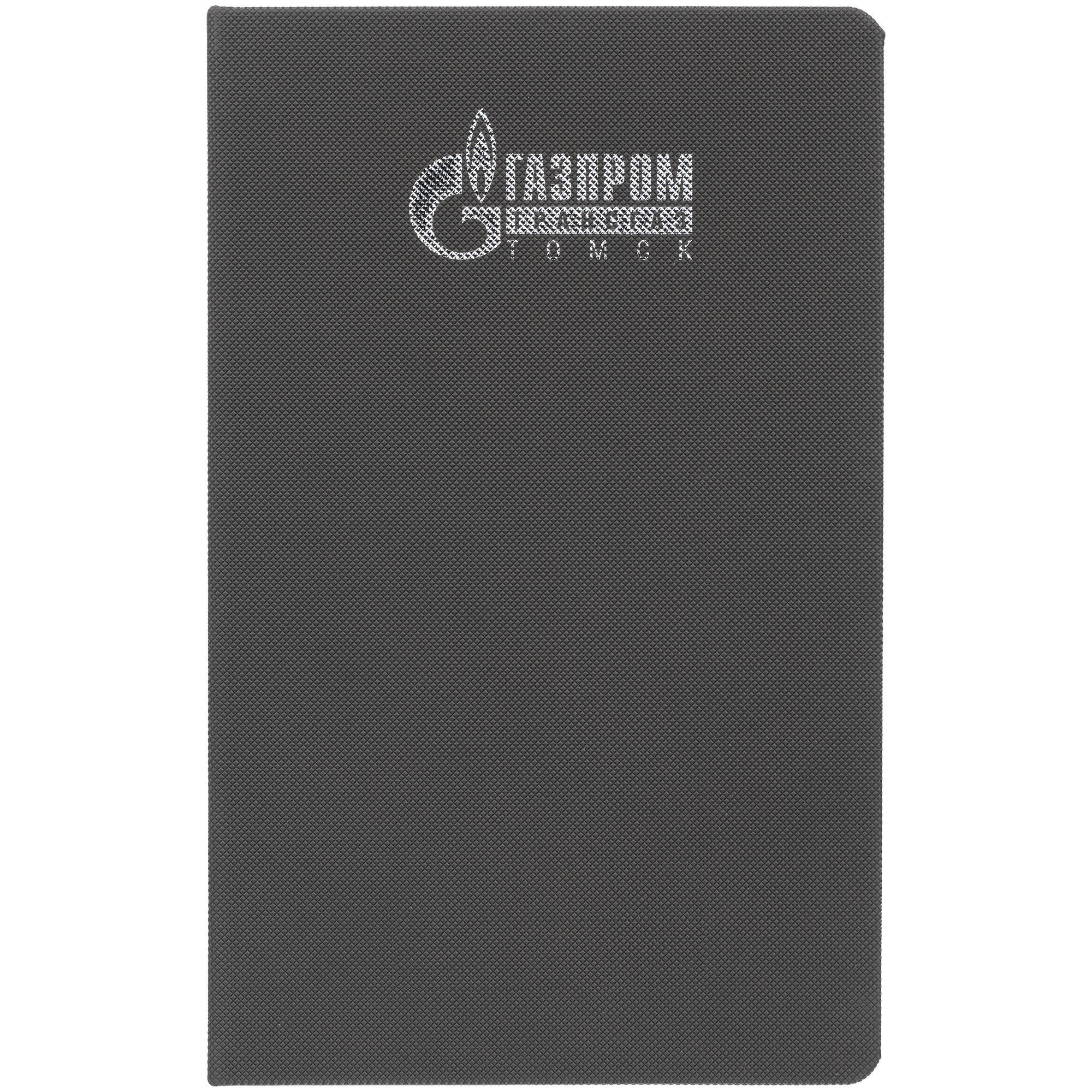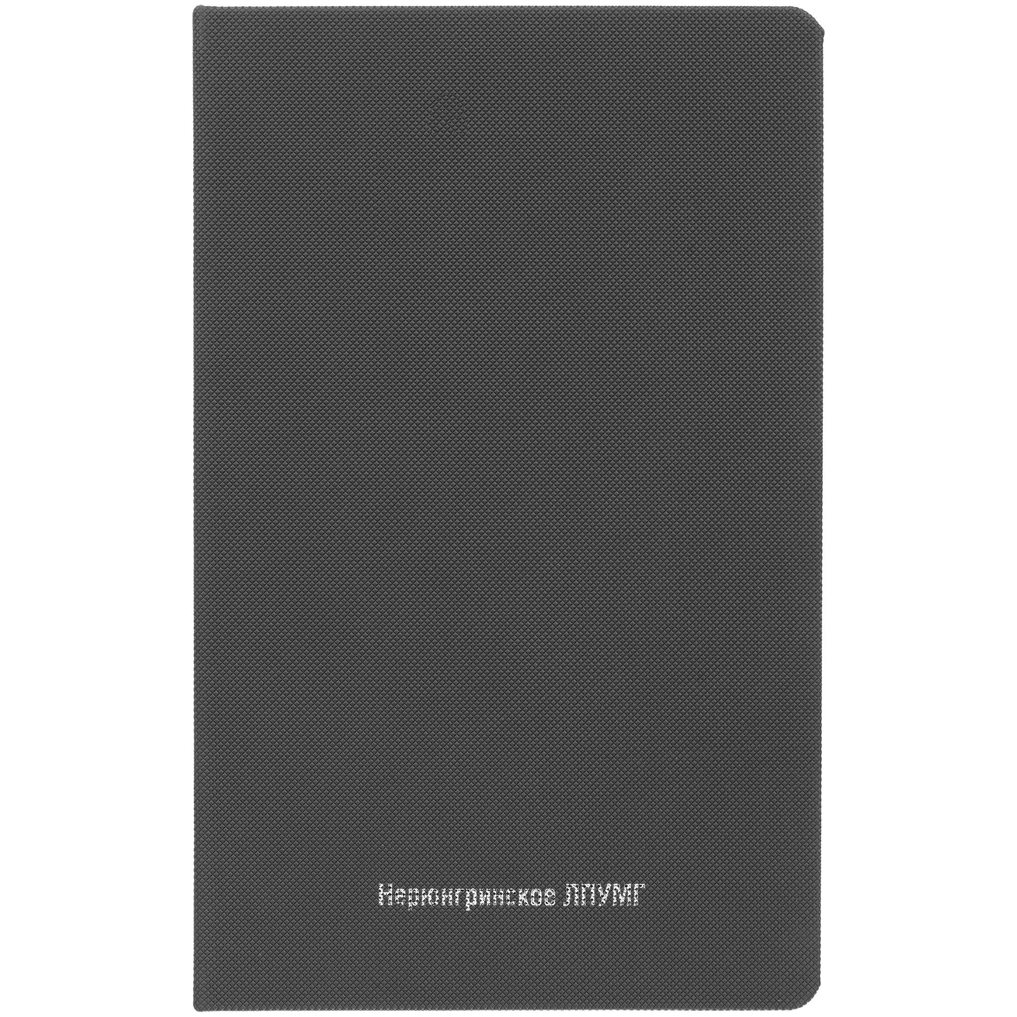 Ежедневник с твердой обложкой, выполнен из материала Canyon, темно-серый ЕЕ, дополнен ляссе в цвет обложки.