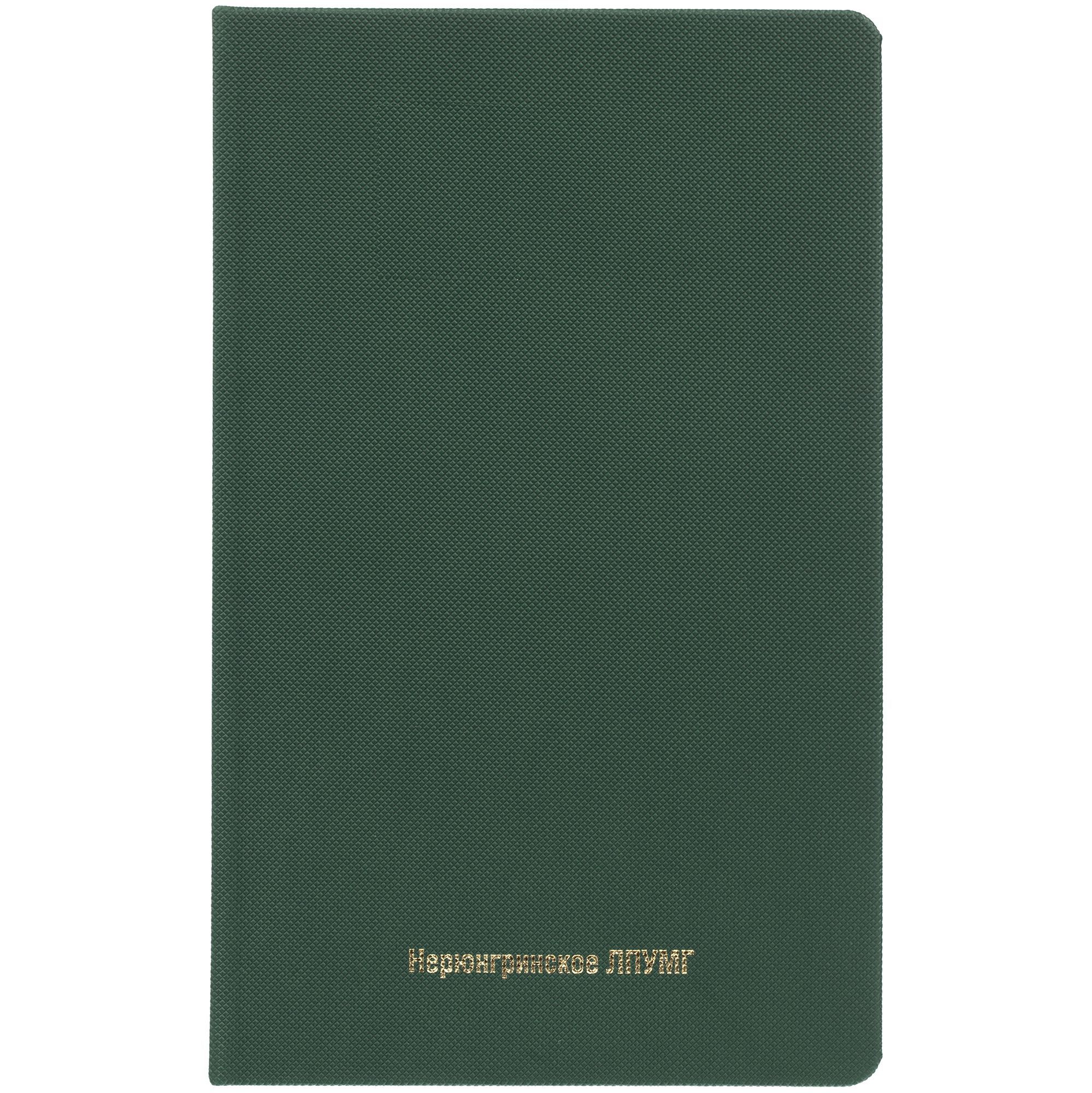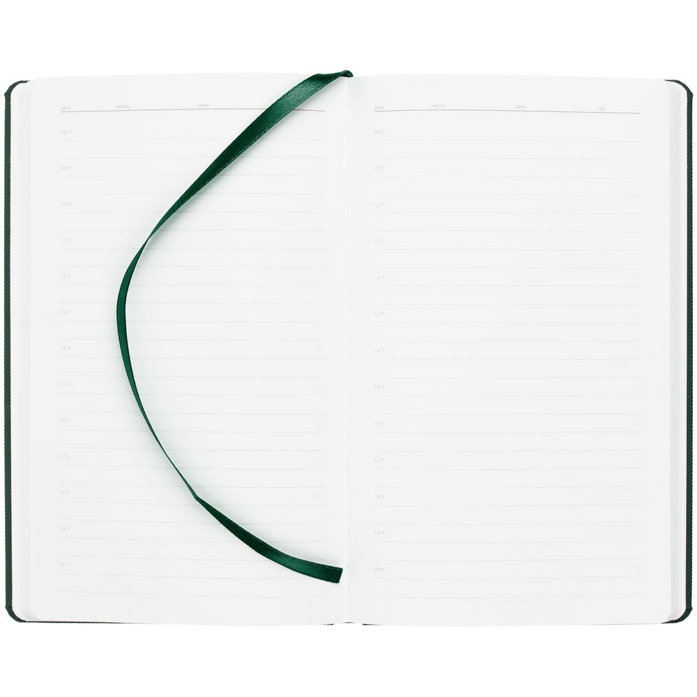Ежедневник с твердой обложкой, выполнен из материала Canyon, зеленый FF, дополнен ляссе в цвет обложки.