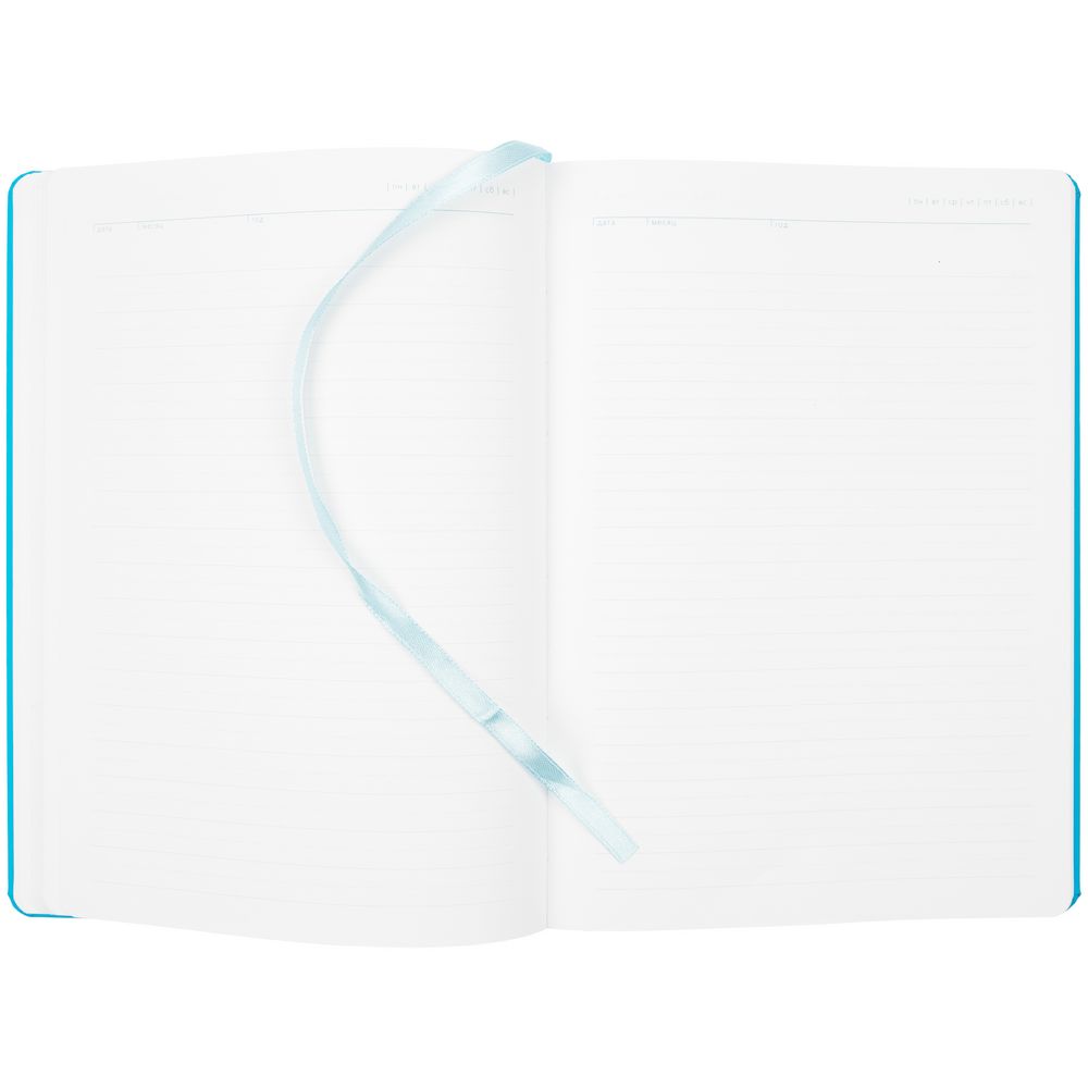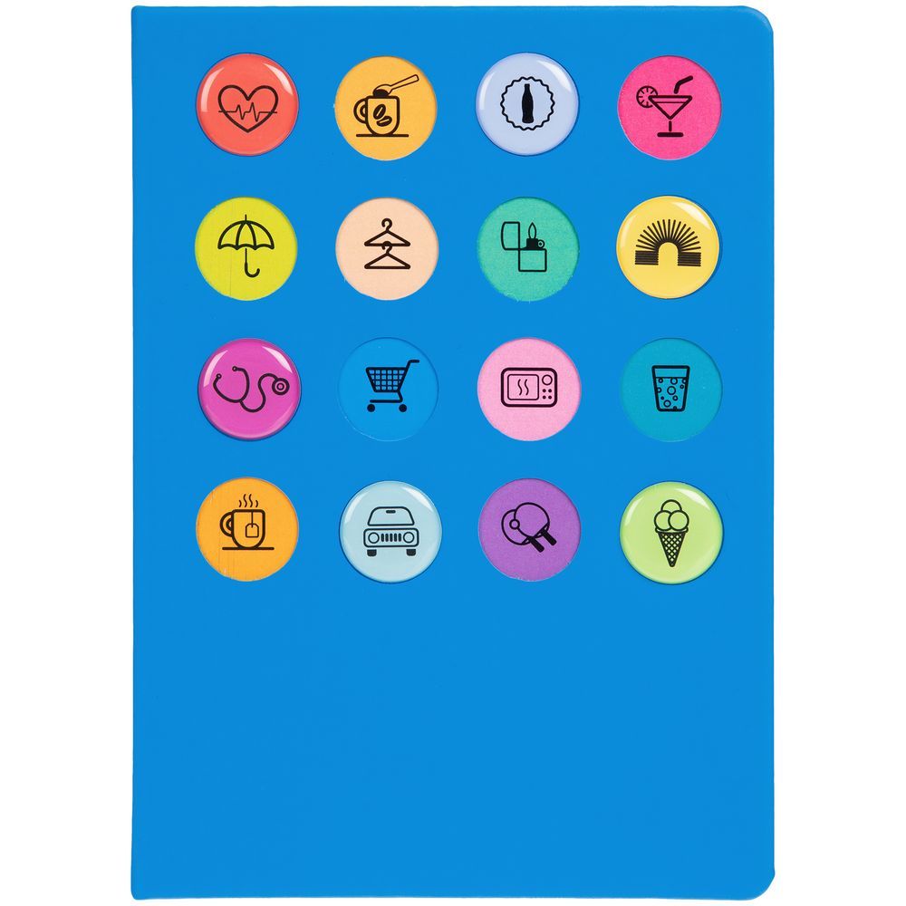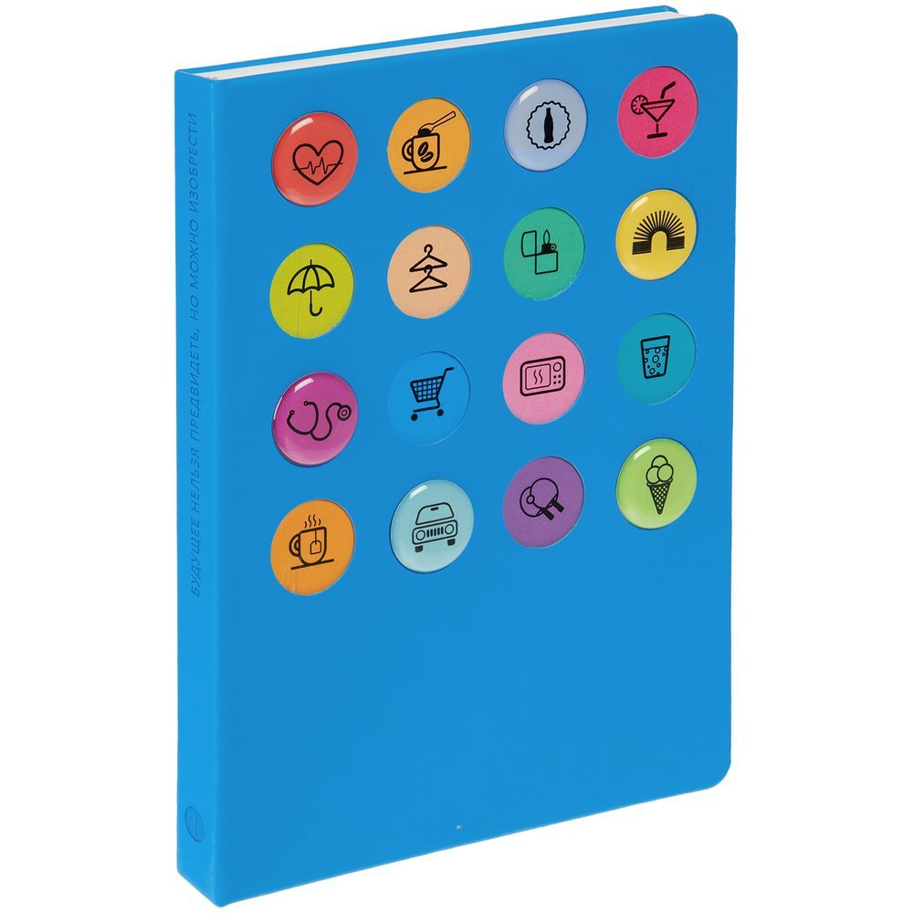 Обложка ежедневника из материала Soft Touch. На корешке обложки выполнено блинтовое тиснение, обложка дополнена вырубкой с печатью на бумаге и полимерными наклейками под смолой.