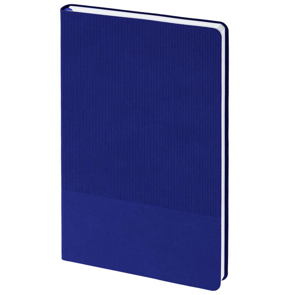 Ежедневник с гибкой обложкой, выполнен из материала Canyon, синий НН, дополнен ляссе в цвет обложки. Блинтовое тиснение на обложке создает эффект вязаного полотна.