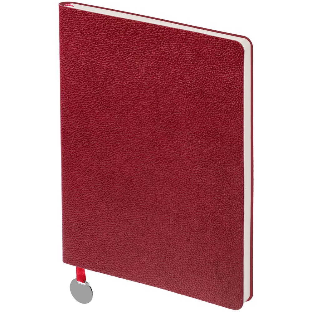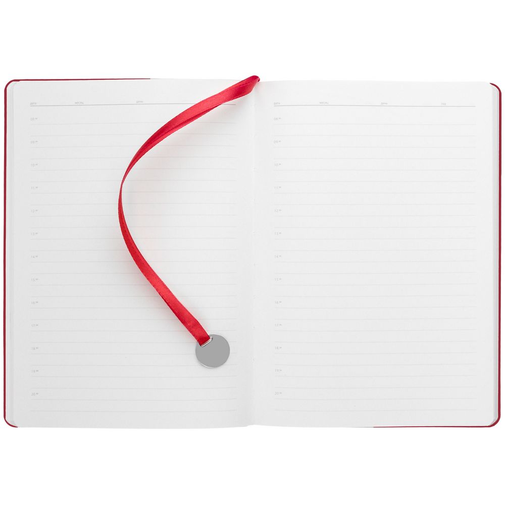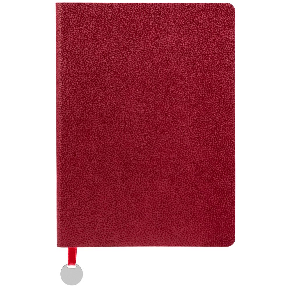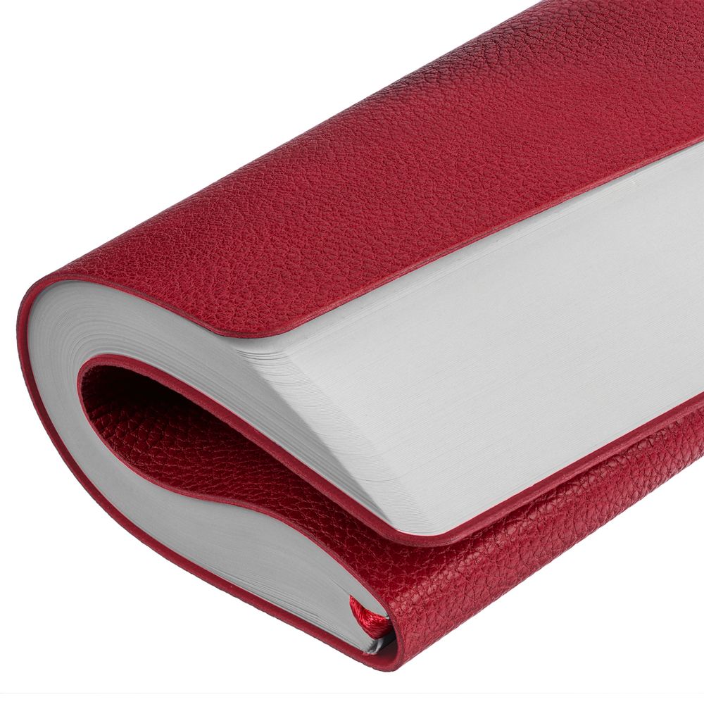 Ежедневник с гибкой обложкой, выполнен из материал La Fite, красный РР, дополнен ляссе в цвет обложки с металлическим шильдом.