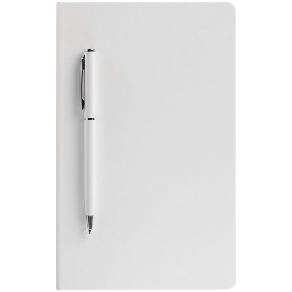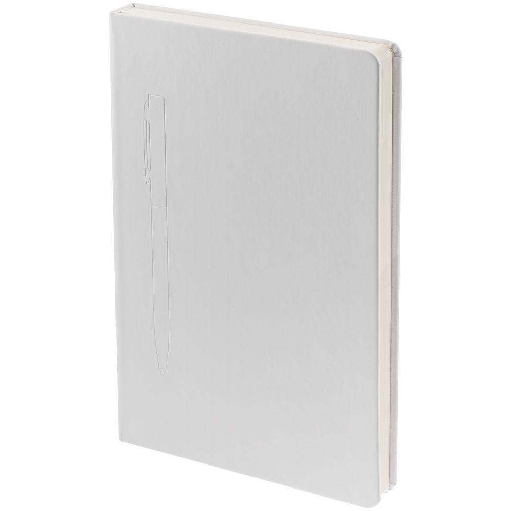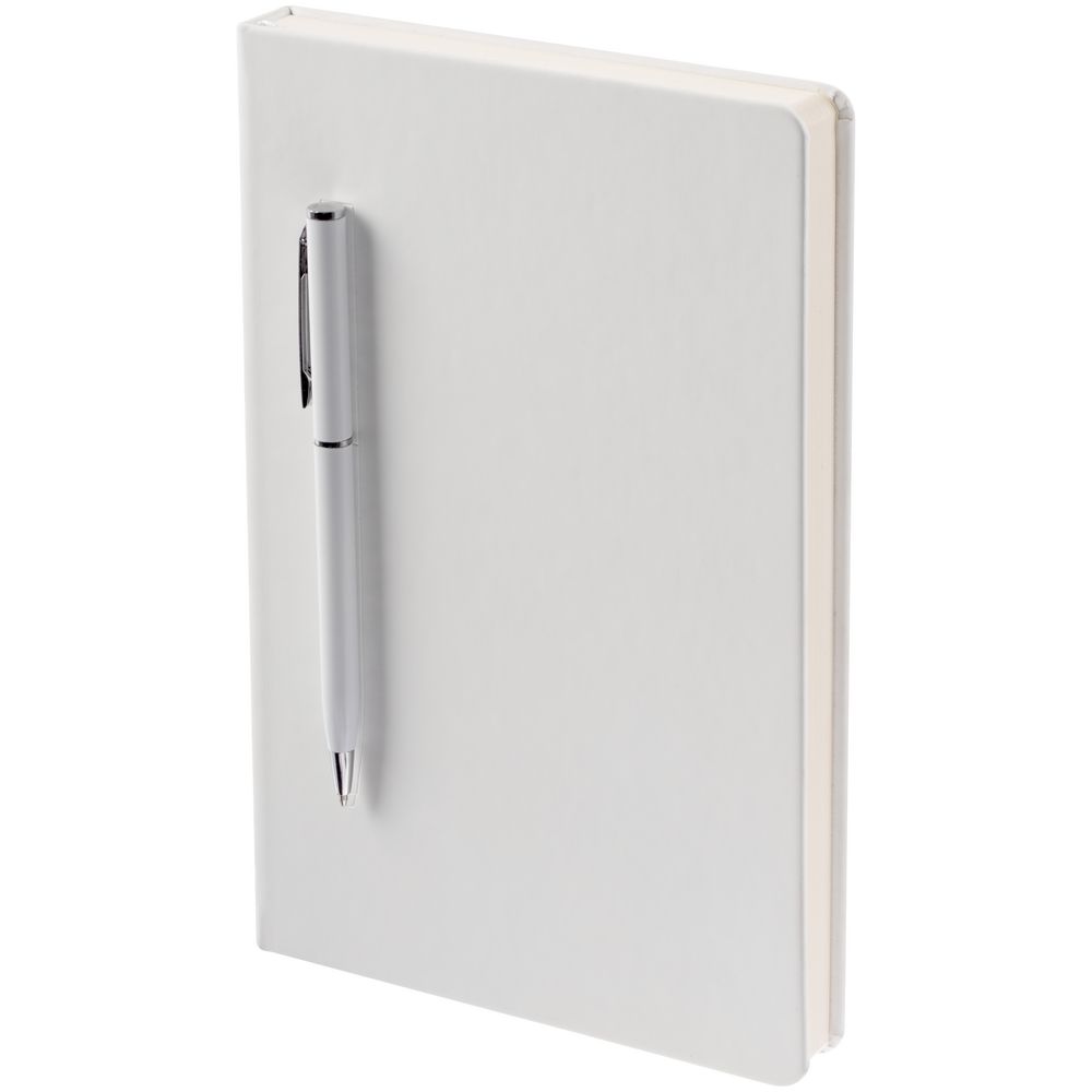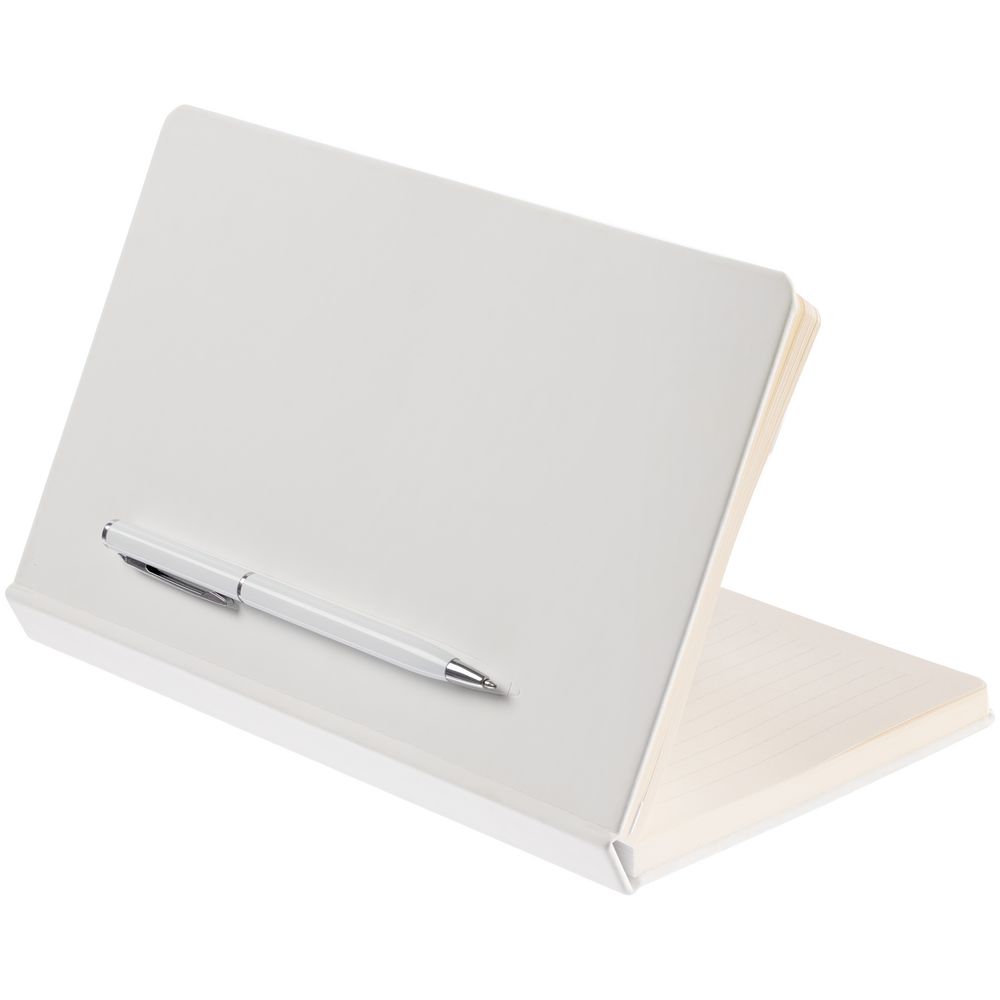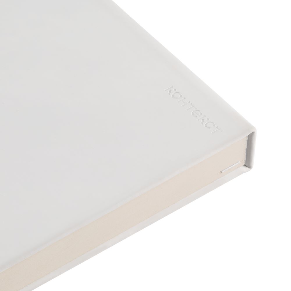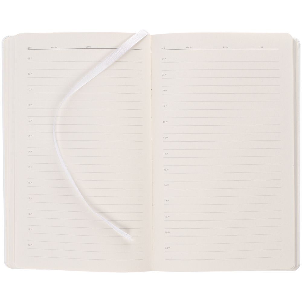 Ежедневник в твердой обложке, выполненной из материала Soft Touch, белый ВВ, дополнен атласным ляссе и магнитом, удерживающим ручку.