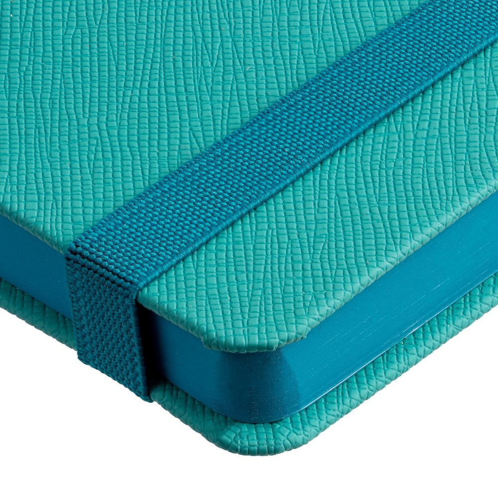 Ежедневник с полутвердой обложкой выполнен из материала Nice Touch, морская волна II, и дополнен резинкой шириной 1 см с металлическим шильдом и ляссе в цвет обложки.