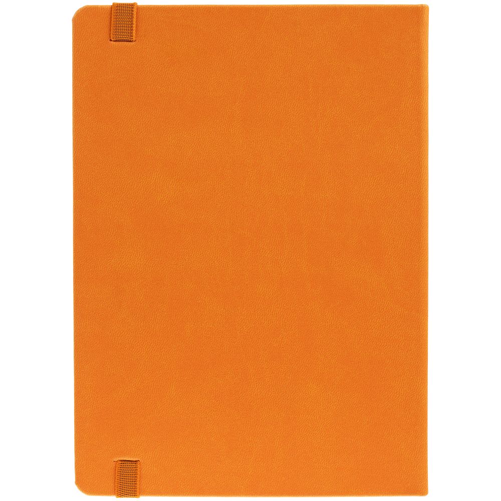 Ежедневник с твердой обложкой, выполнен из материала Latte, оранжевый ОО, обрез оранжевого цвета, дополнен ляссе оранжевого цвета и резинкой с металлическим шильдом.