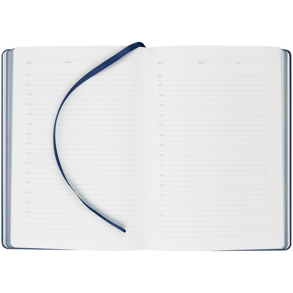 Ежедневник с твердой обложкой, выполнен из материала Latte, темно-синий ХХ, обрез темно-синего цвета, дополнен ляссе темно-синего цвета и резинкой с металлическим шильдом.