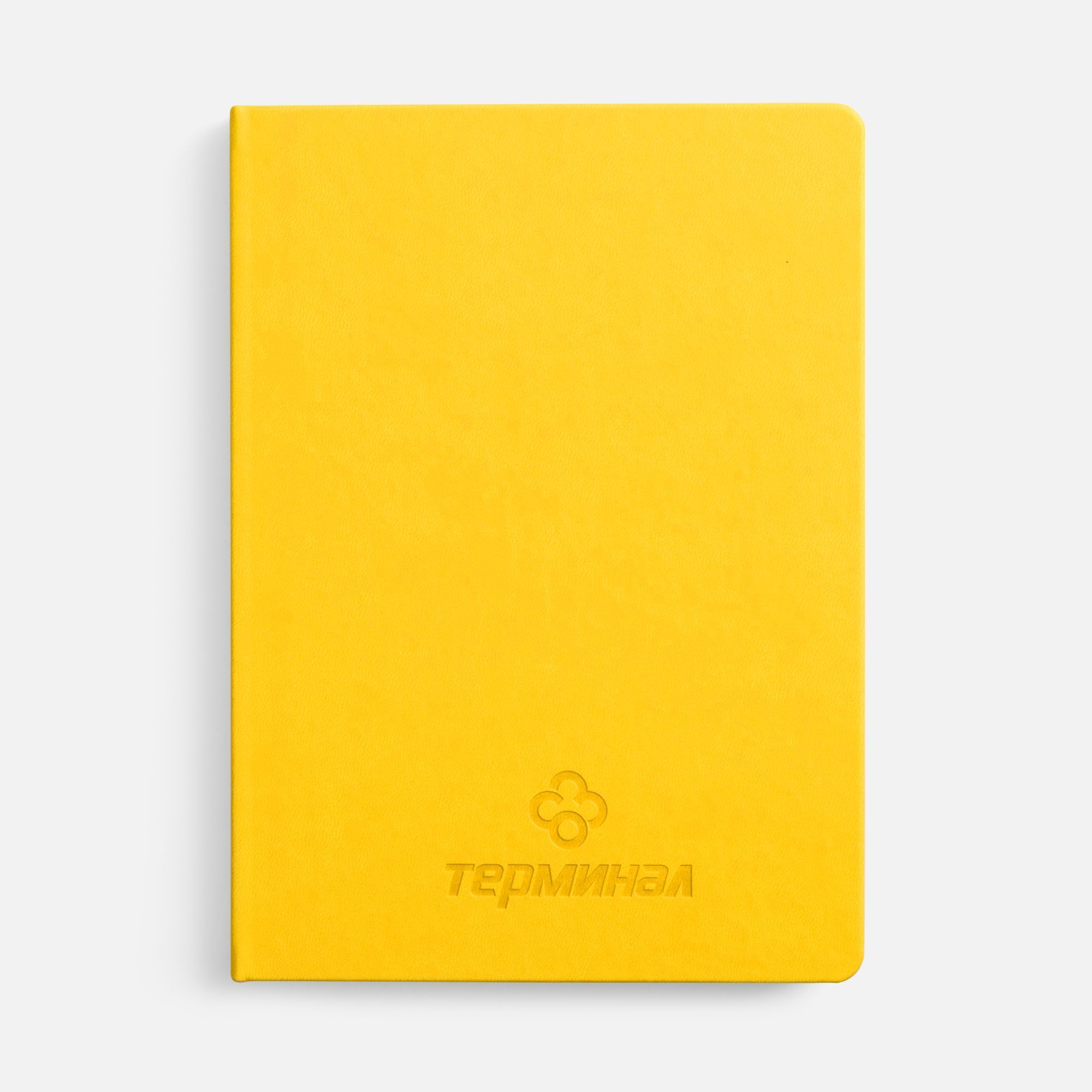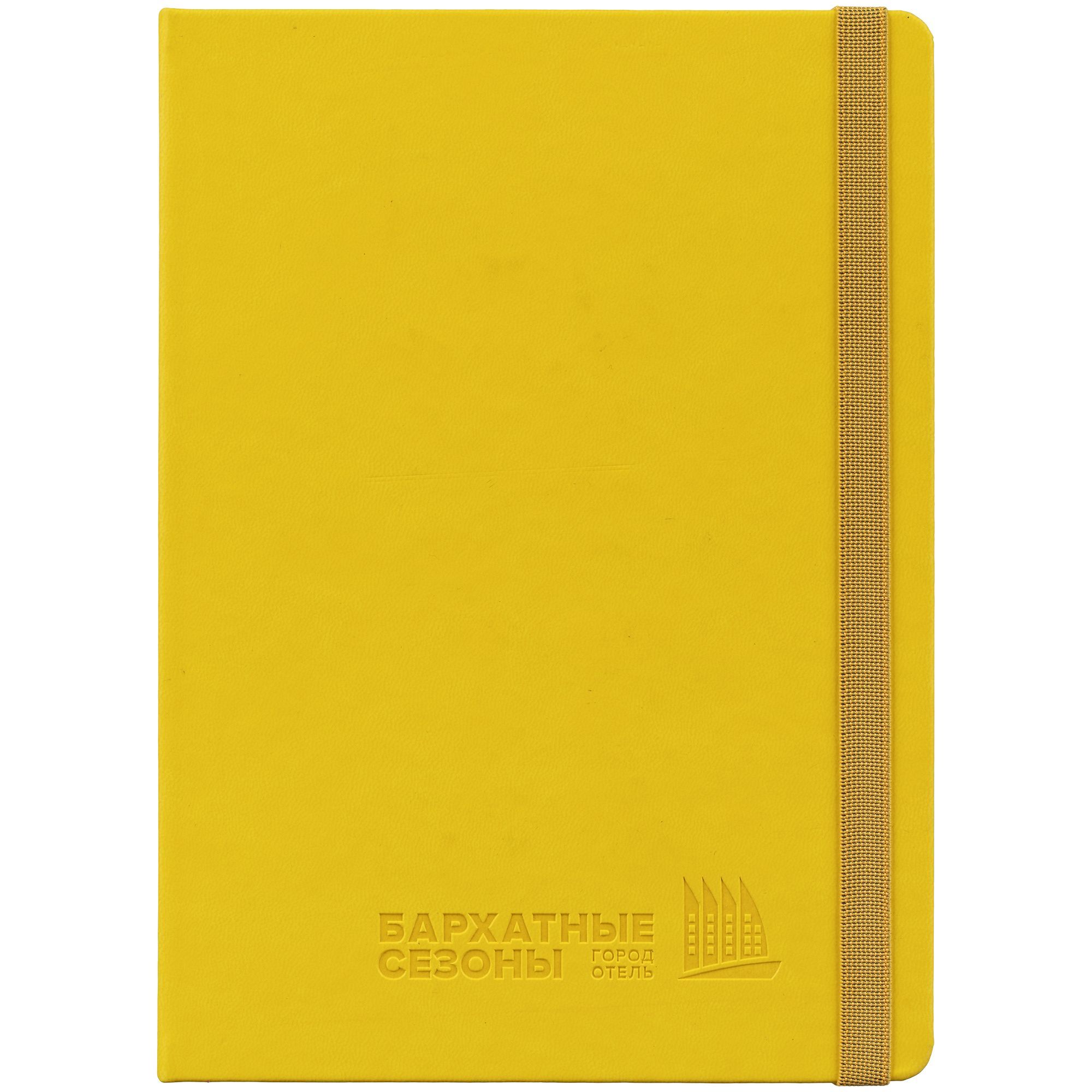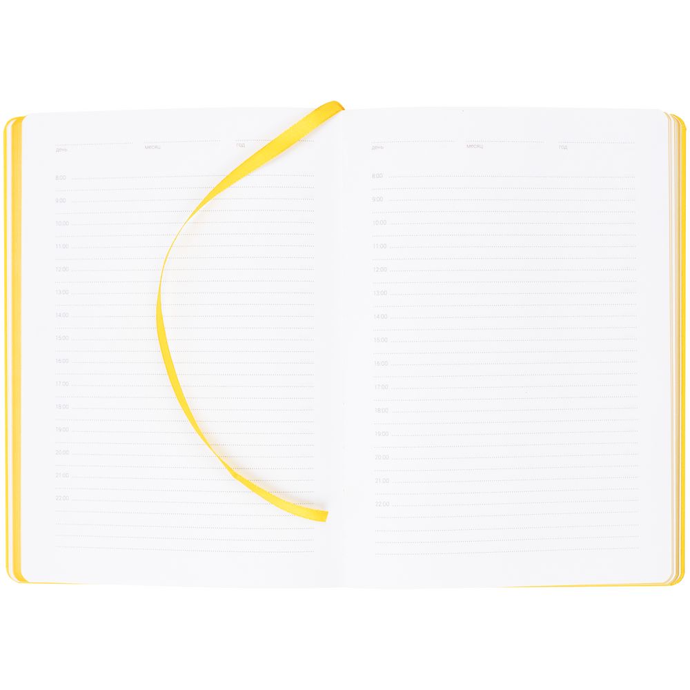 Ежедневник с твердой обложкой, выполнен из материала Latte, желтый КК, обрез зеленого цвета, дополнен ляссе желтого цвета и резинкой с металлическим шильдом.
