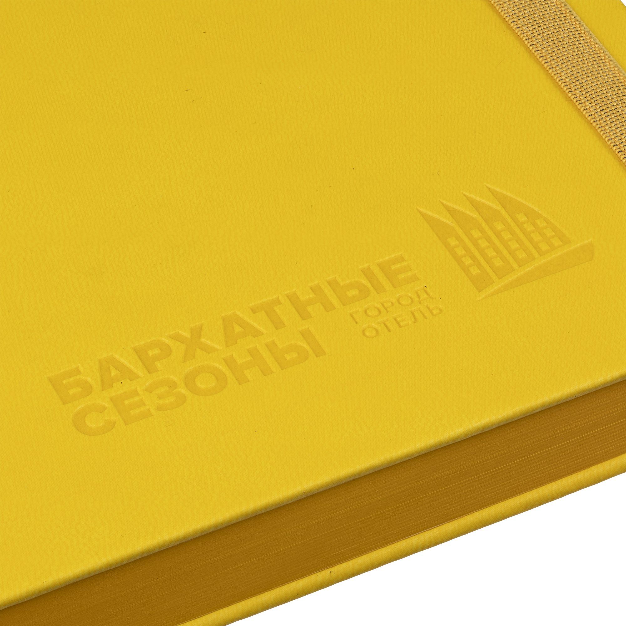Ежедневник с твердой обложкой, выполнен из материала Latte, желтый КК, обрез зеленого цвета, дополнен резинкой и ляссе желтого цвета.