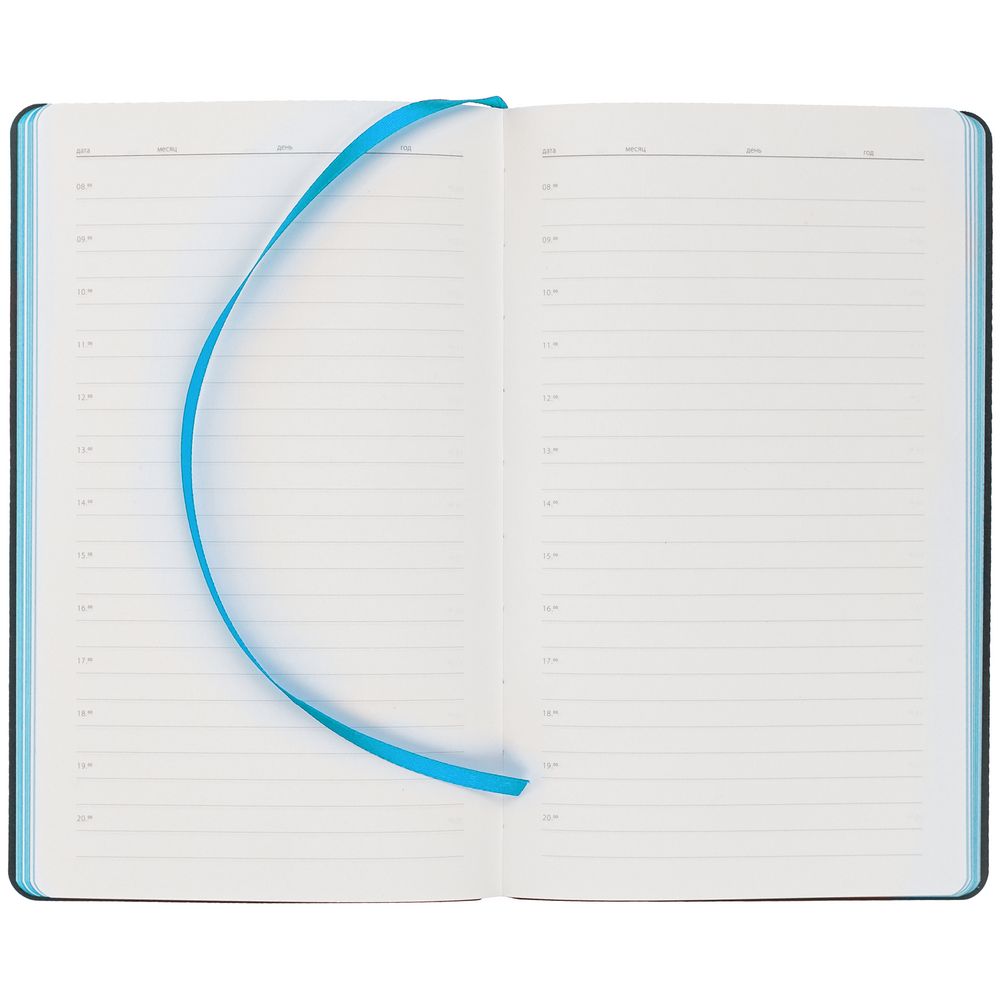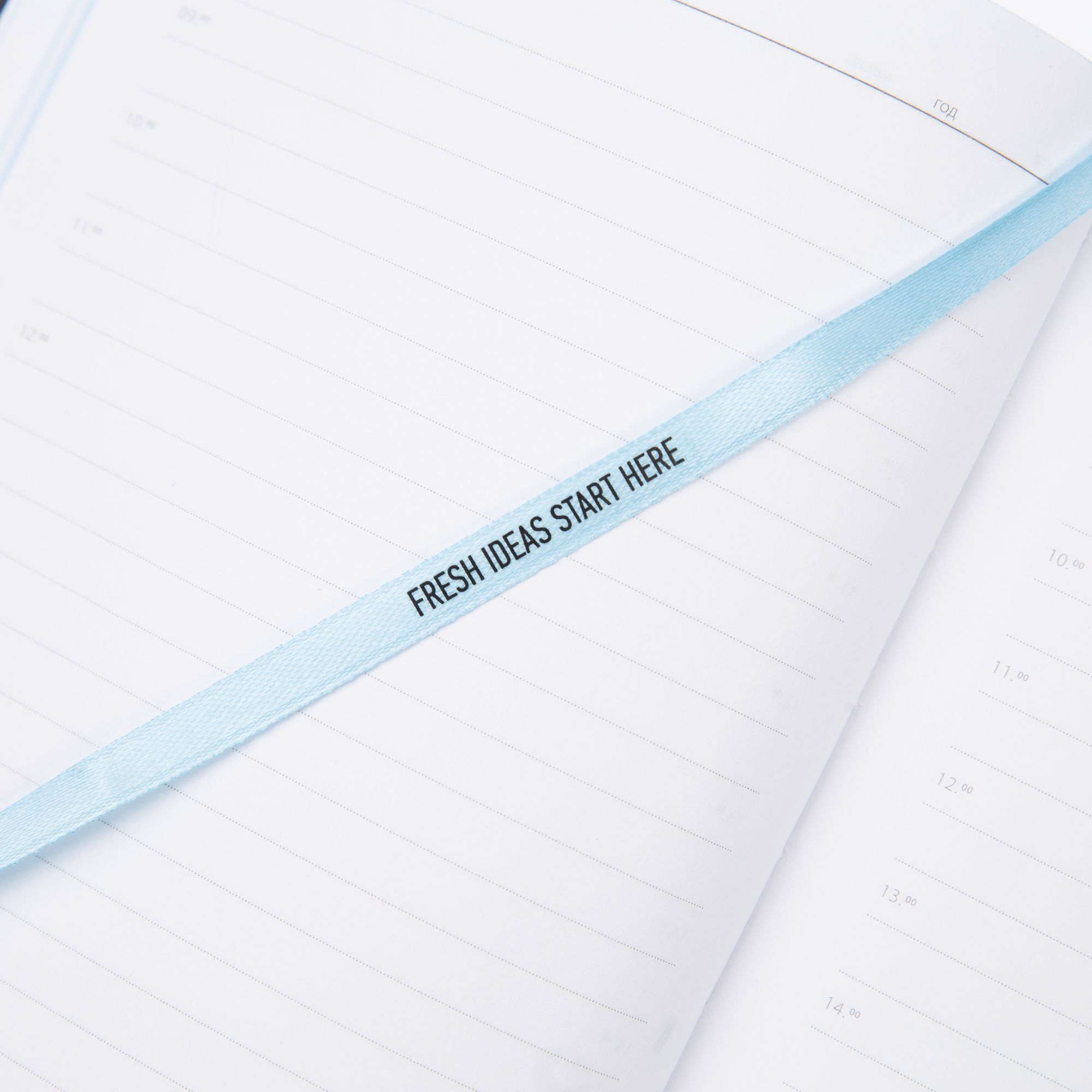 Ежедневник с гибкой обложкой выполнен из материала Nice Touch, черный АА и Soft Touch Ultra, голубой JJ, дополнен ляссе голубого цвета.