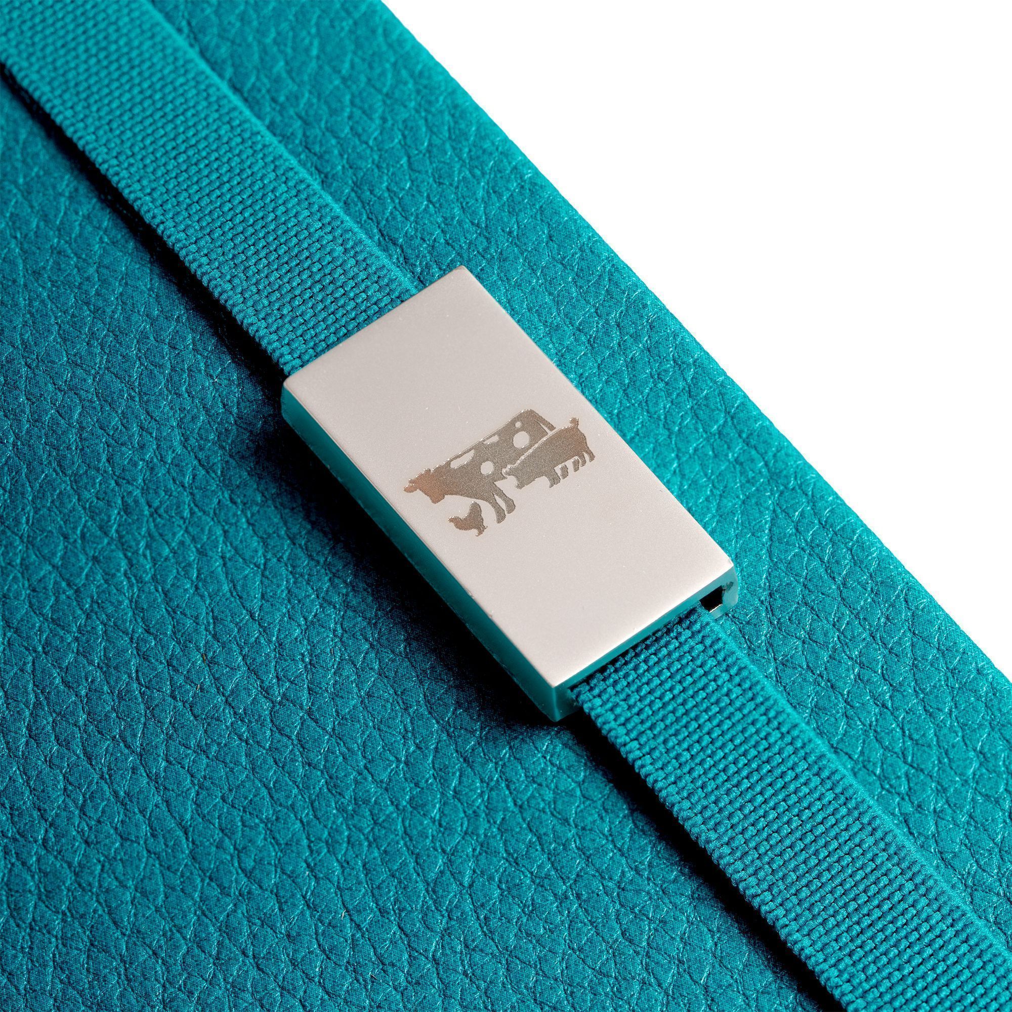 Зауженный ежедневник с прямоугольным металлическим шильдом на резинке.