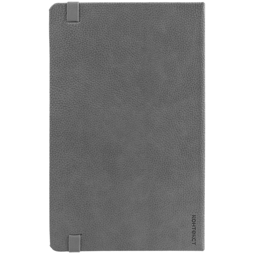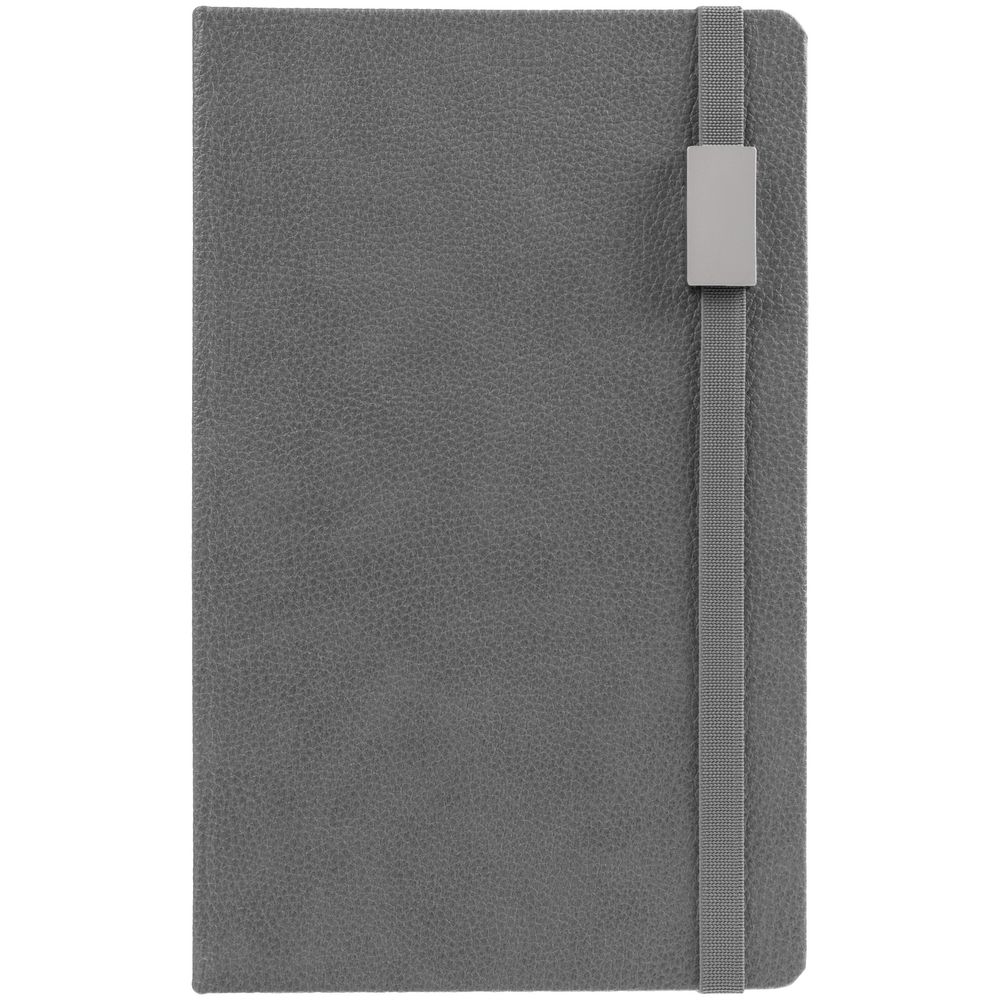 Ежедневник с твердой обложкой, выполнен из материала LaFite, серый СС, дополнен резинкой с металлическим прямоугольным шильдом и ляссе в цвет обложки.