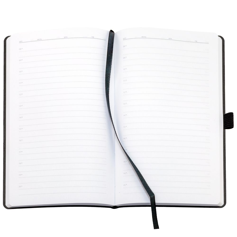Ежедневник с гибкой обложкой, выполнен из материала Nubuck Touch, зеленый VV, дополнен ляссе и петлей-резинкой для ручки черного цвета.
