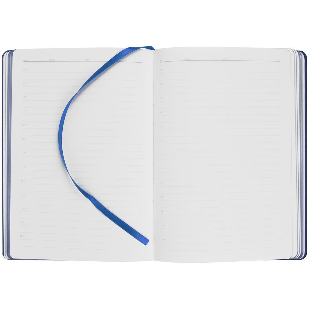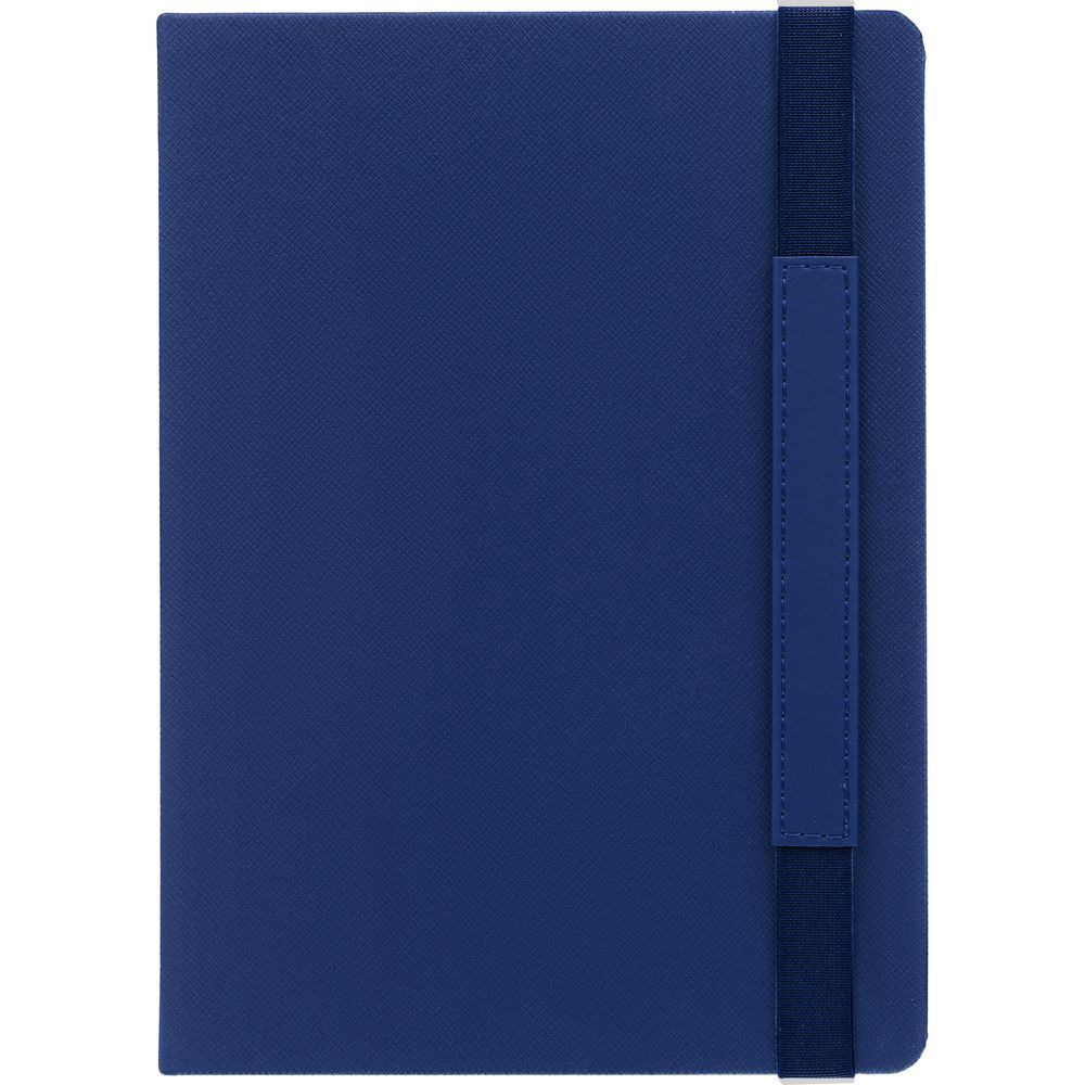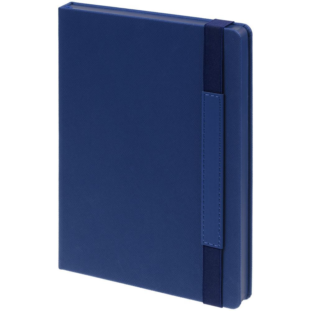 Ежедневник с твердой обложкой, выполнен из материала Nice Touch, синий, дополнен резинкой с лейблом из материала Soft Touch Ultra и ляссе в цвет обложки.