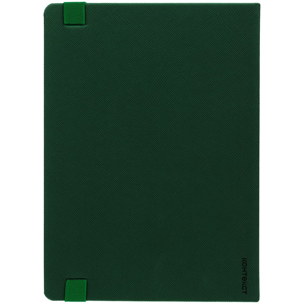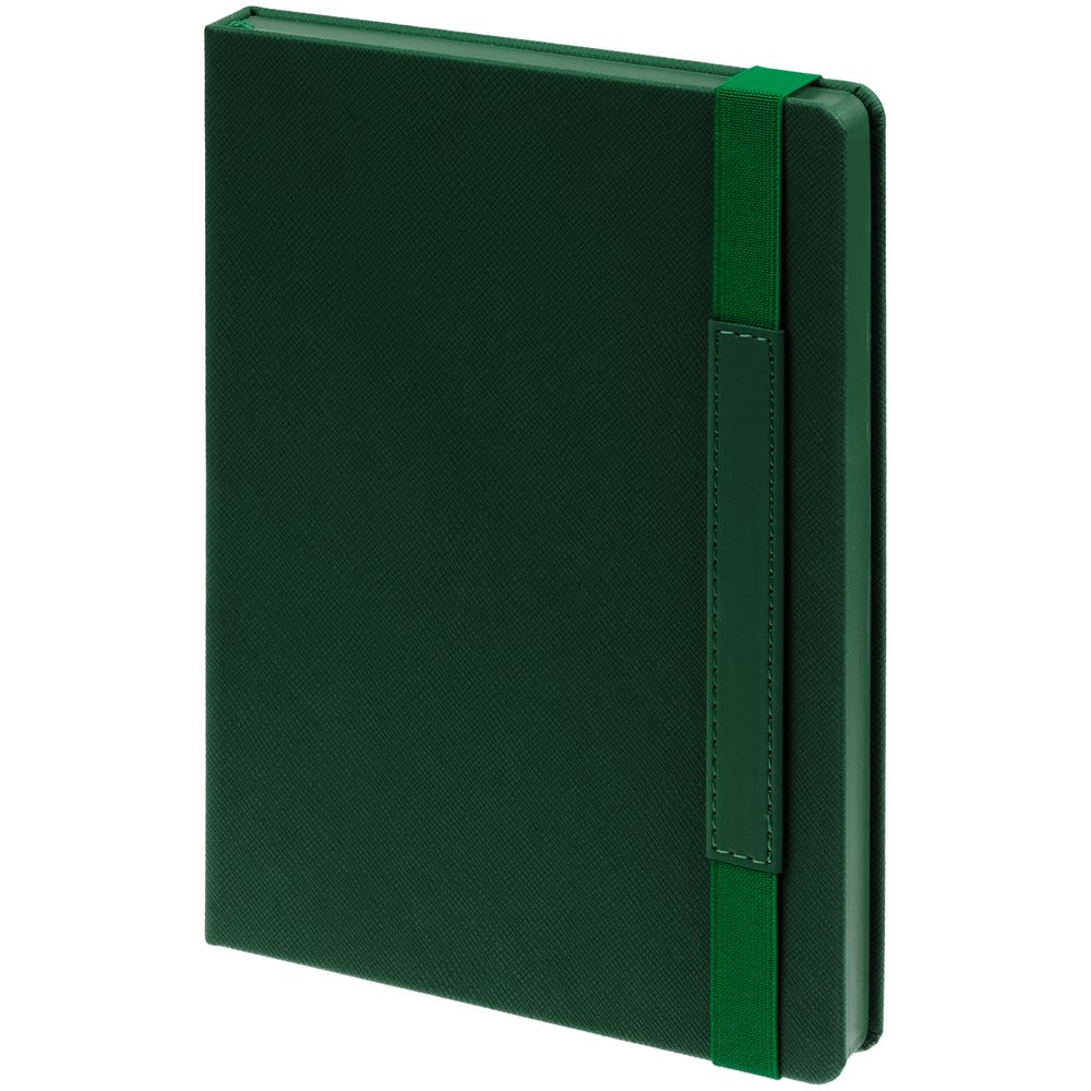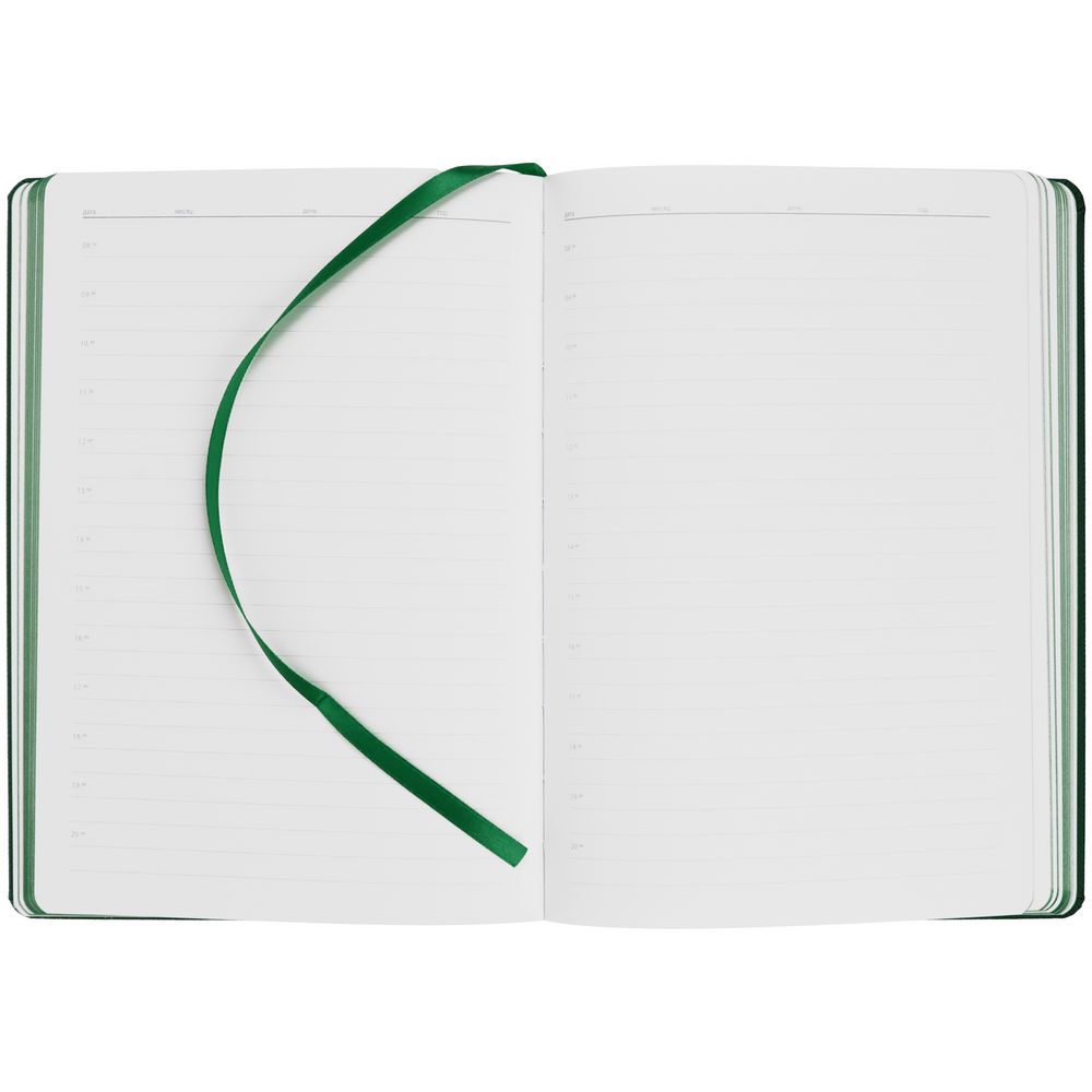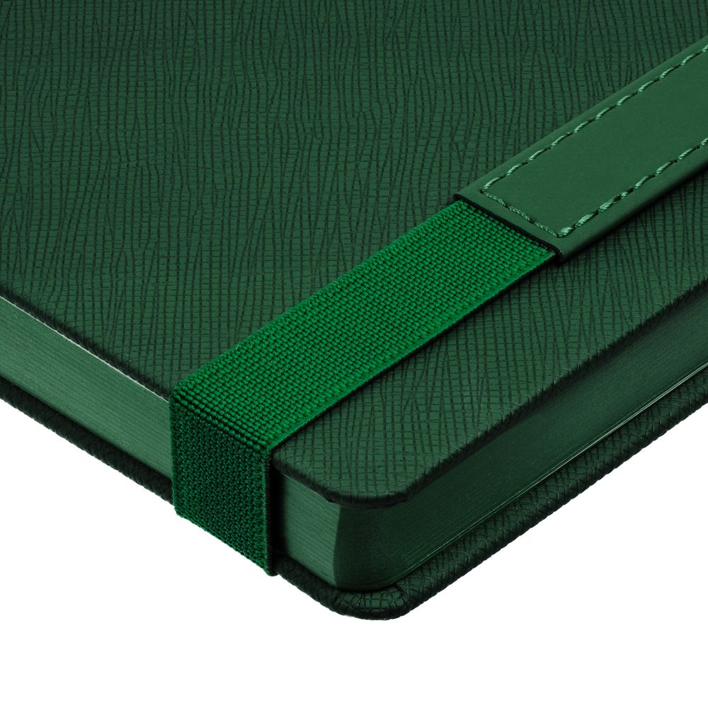 Ежедневник с твердой обложкой, выполнен из материала Nice Touch, зеленый FF, дополнен резинкой с лейблом из материала Soft Touch и ляссе в цвет обложки.