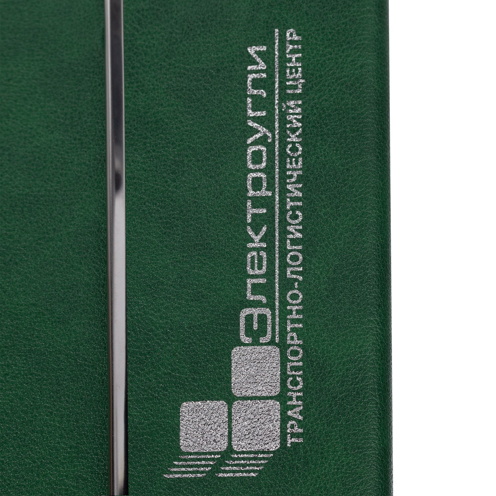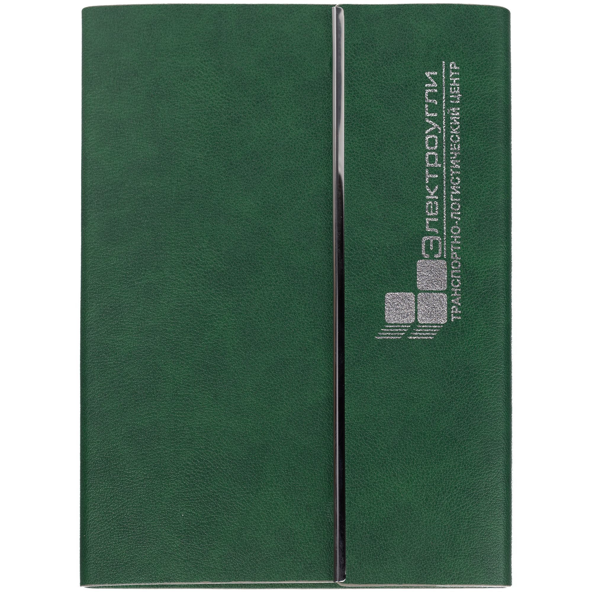 Ежедневник с гибкой обложкой, клапаном на магните и металлической отделкой клапана. Выполнен из материала Petrus, зеленый FF, дополнен серым ляссе.