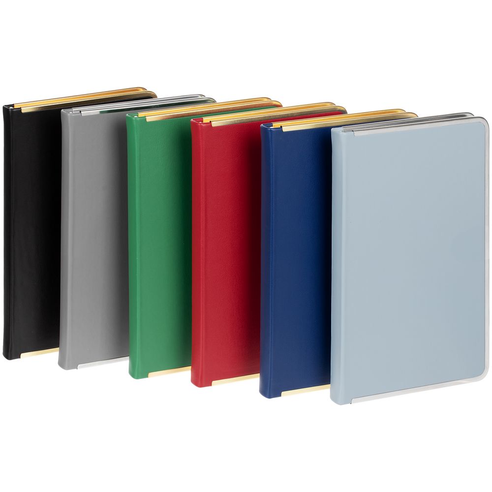 Изящный ежедневник с зауженным блоком и стильными деталями — металлической окантовкой на обложке и металлизированным обрезом.