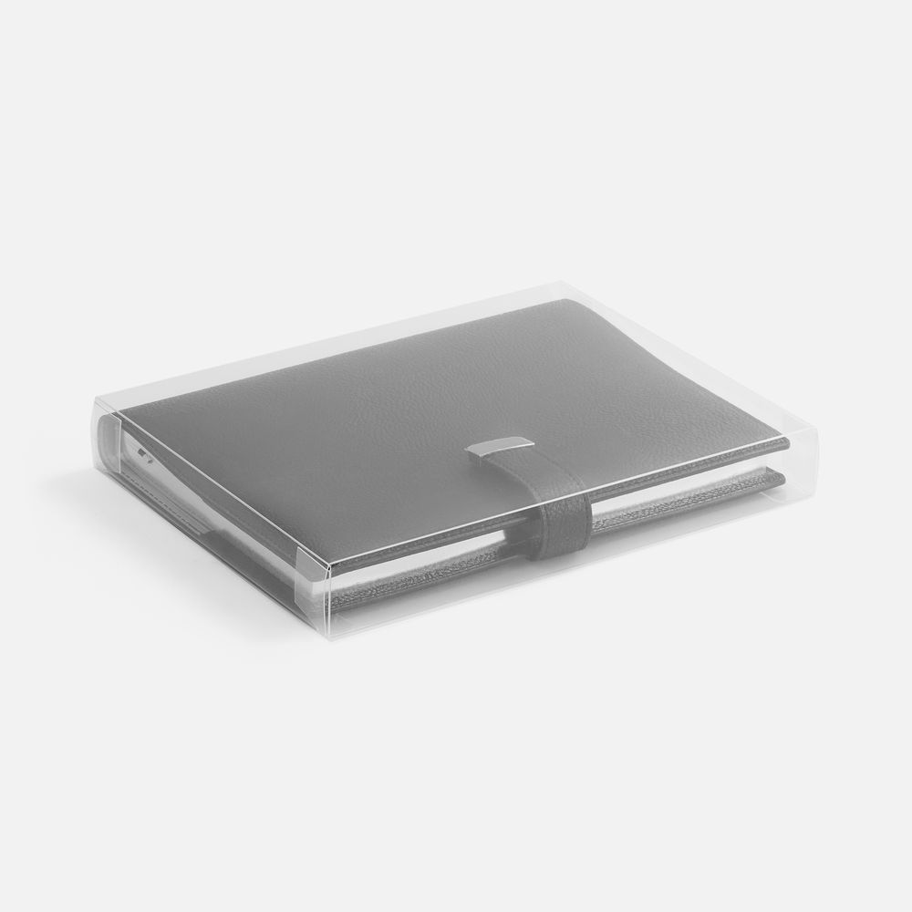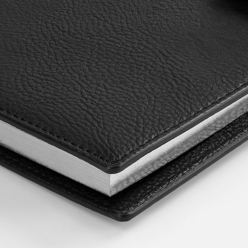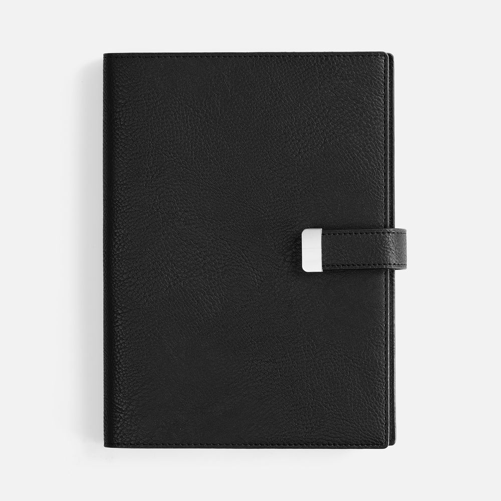 Ежедневник в мягком переплете со съемной обложкой, дополнен застежкой-хлястиком с металлическим шильдом на кнопке, двойным ляссе и капталом.