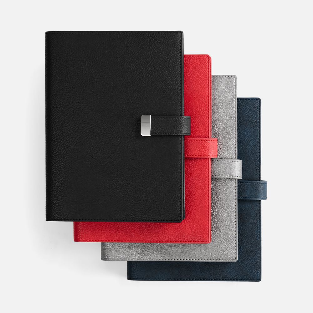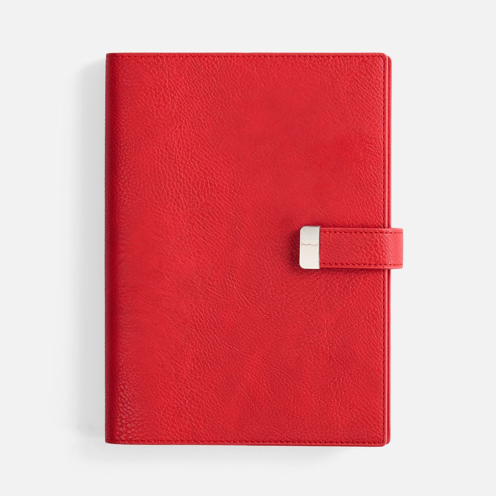 Ежедневник в мягком переплете со съемной обложкой, дополнен застежкой-хлястиком с металлическим шильдом на кнопке, двойным ляссе и капталом.