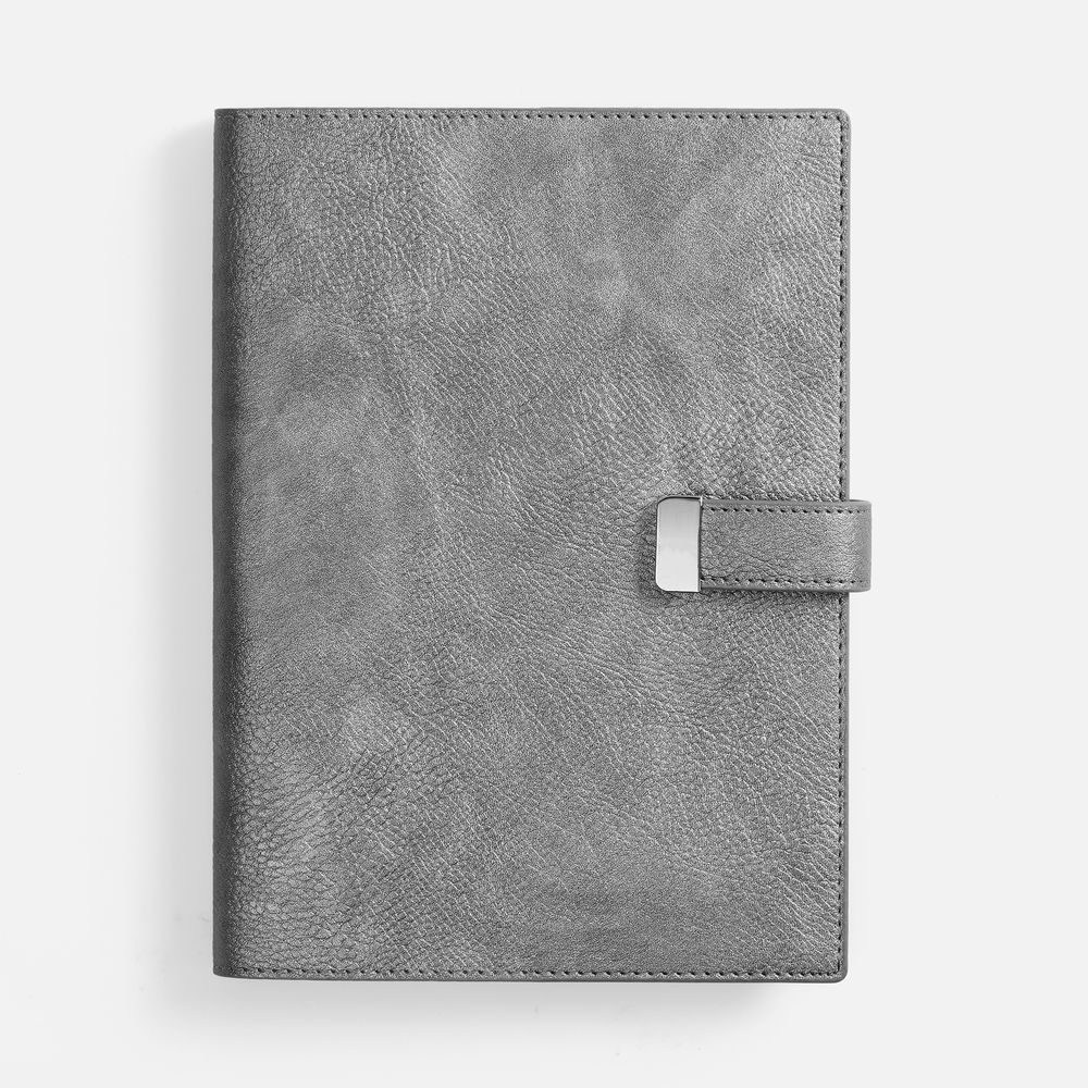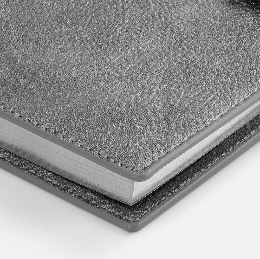 Ежедневник в мягком переплете со съемной обложкой, дополнен застежкой-хлястиком с металлическим шильдом на кнопке, двойным ляссе и капталом.