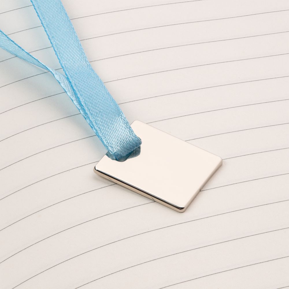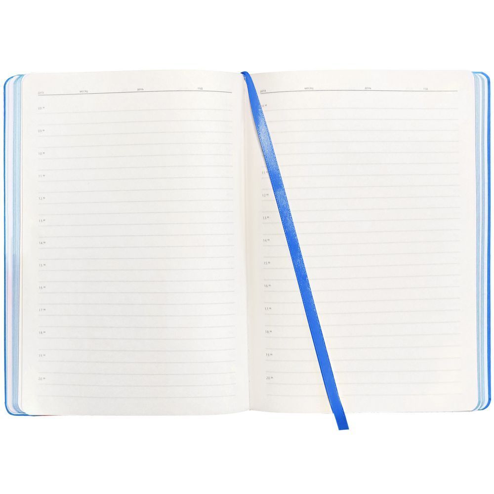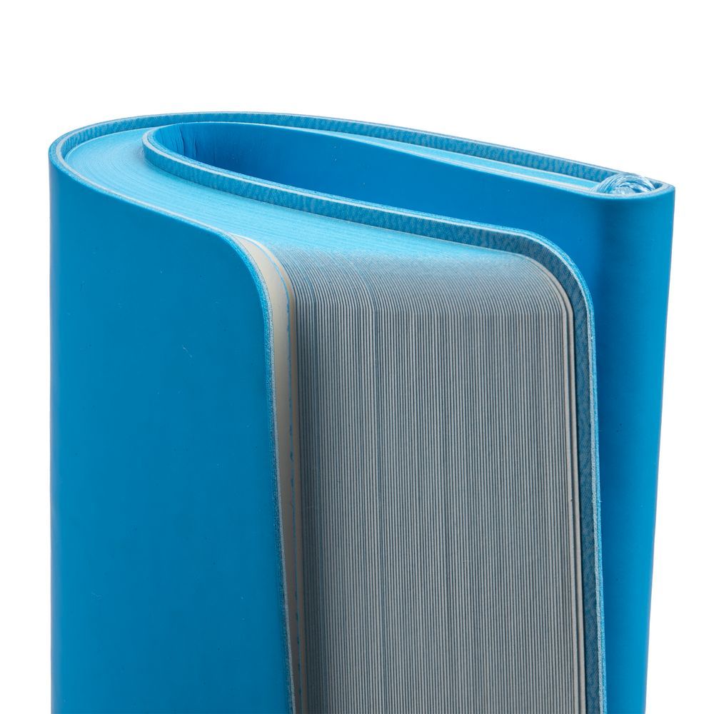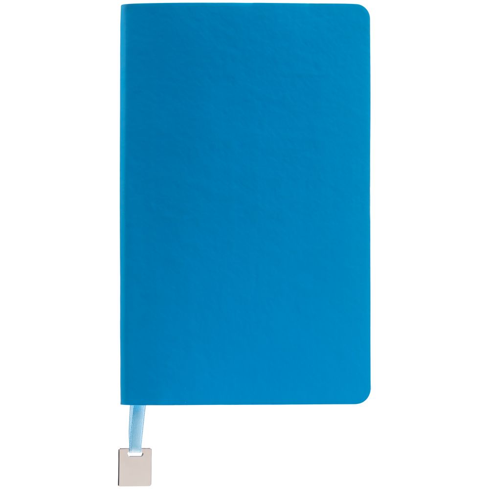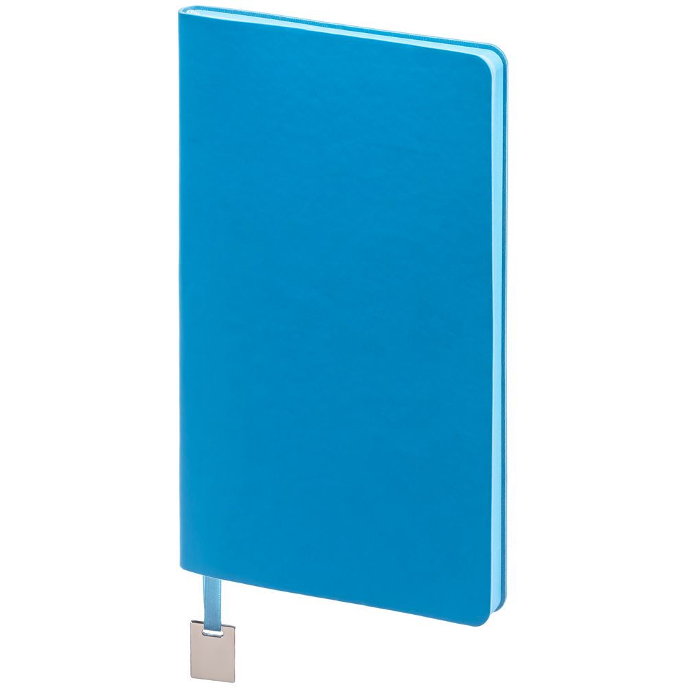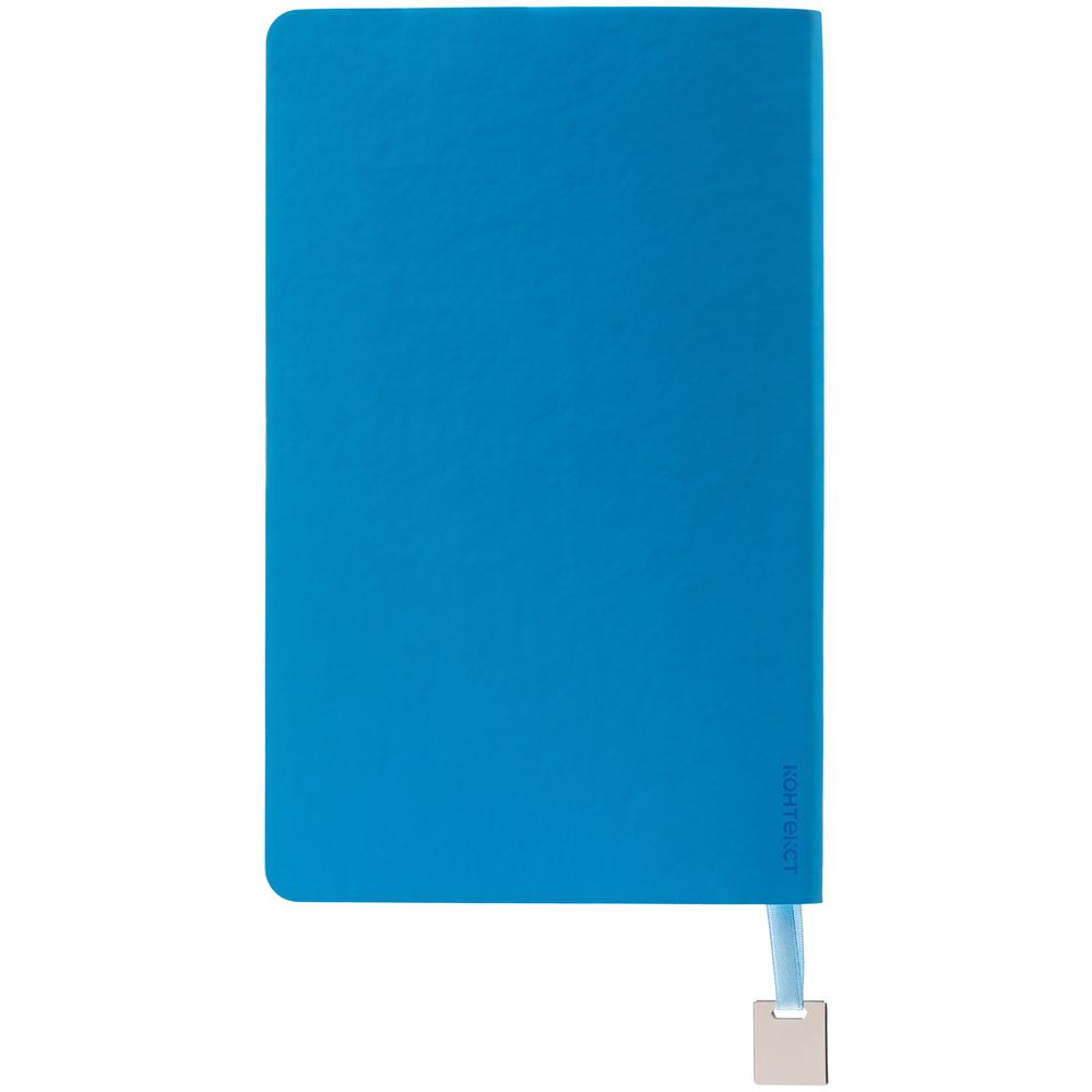 Ежедневник с гибкой обложкой, выполнен из материалов Soft Touch Ultra, голубой JJ, и Latte, голубой (внутренняя часть обложки), дополнен ляссе в цвет обложки с металлическим шильдиком.