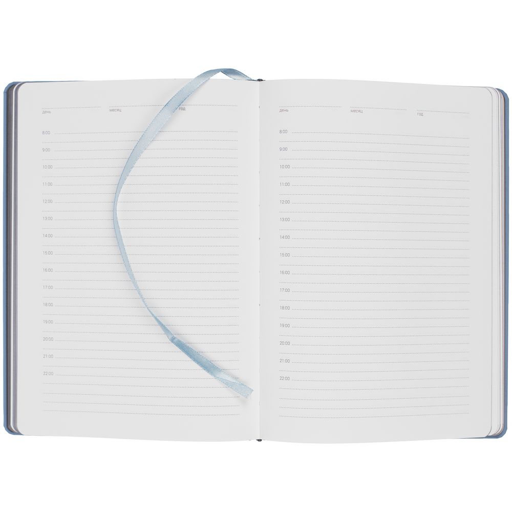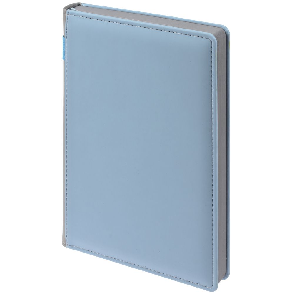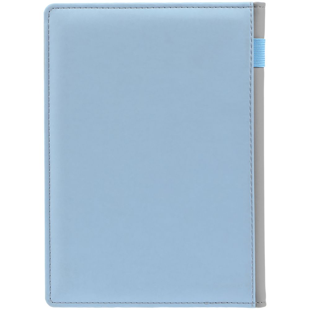 Твердая обложка с поролоном, материал обложки — Soft Touch, голубой JJ и Soft Touch, серый СС. На корешке ежедневника находится петля из резинки.
