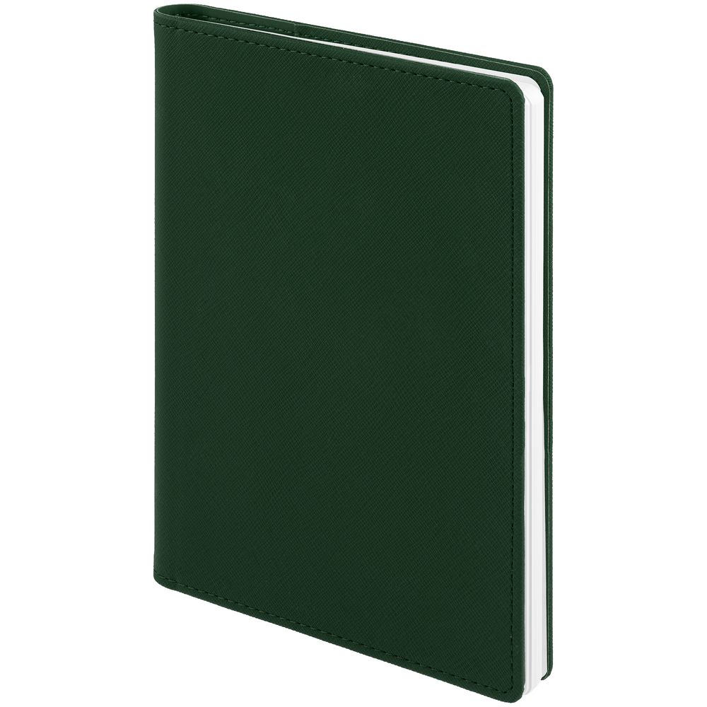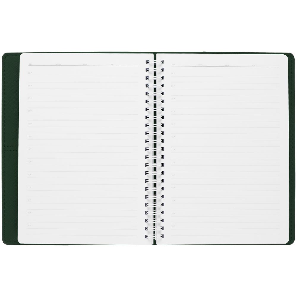 Ежедневник с блоком на пружине в твердой обложке, выполнен из материалов Nice Touch, Soft Touch и Soft Touch Ultra зеленый.
