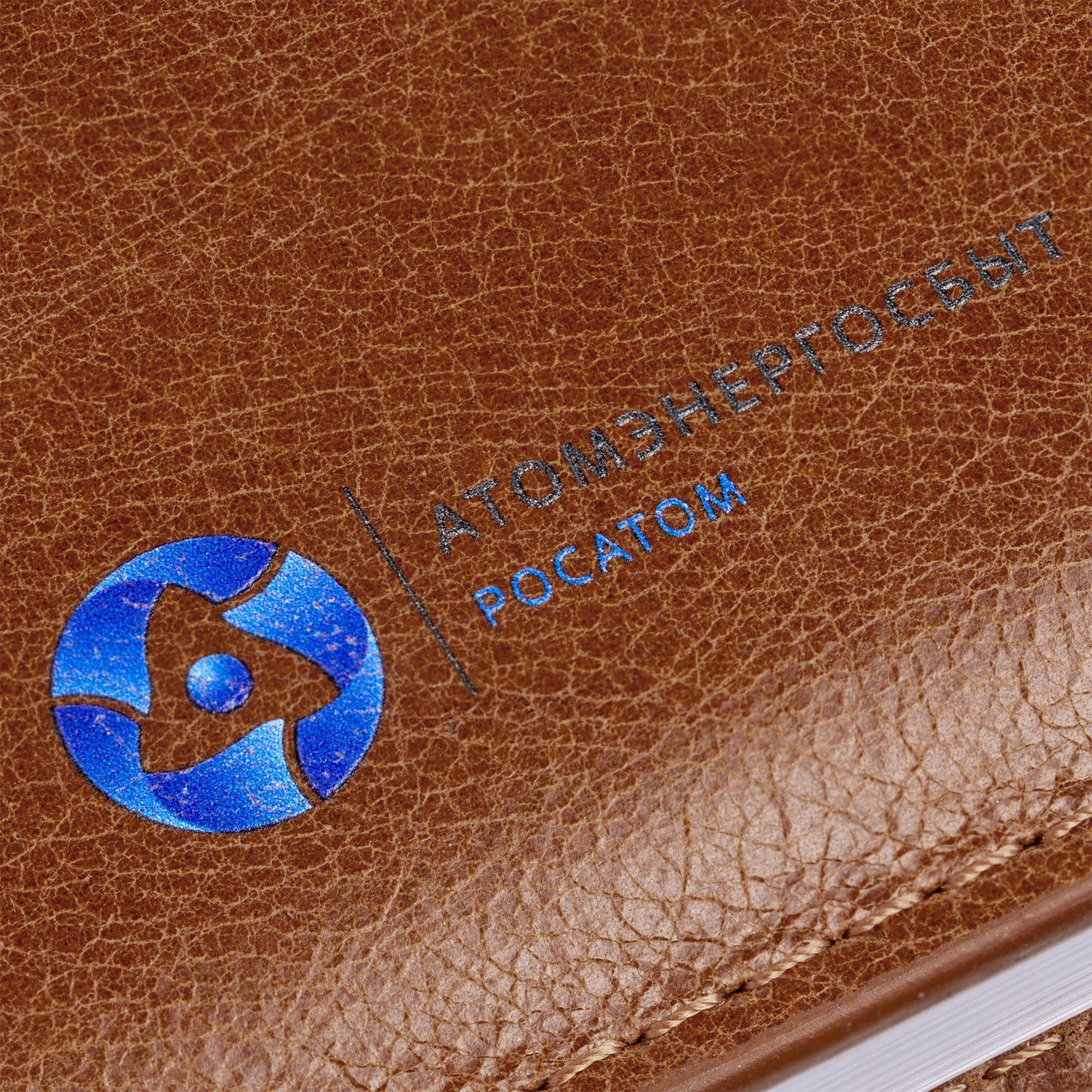 Ежедневник с полутвердой обложкой из натуральной кожи с поролоном. Каптал, репсовое ляссе и окрашенный срез обложки в цвет материала.